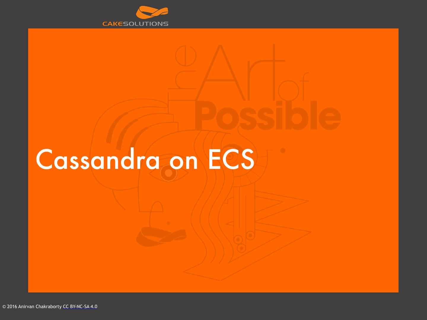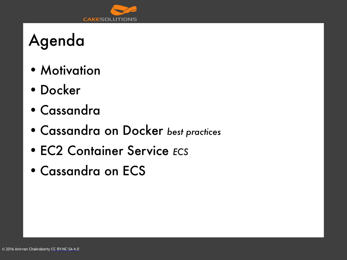 2 . Agenda • Motivation • Docker • Cassandra • Cassandra on Docker best practices • EC2 Container Service ECS • Cassandra on ECS © 2016 Anirvan Chakraborty CC BY-NC-SA 4.0