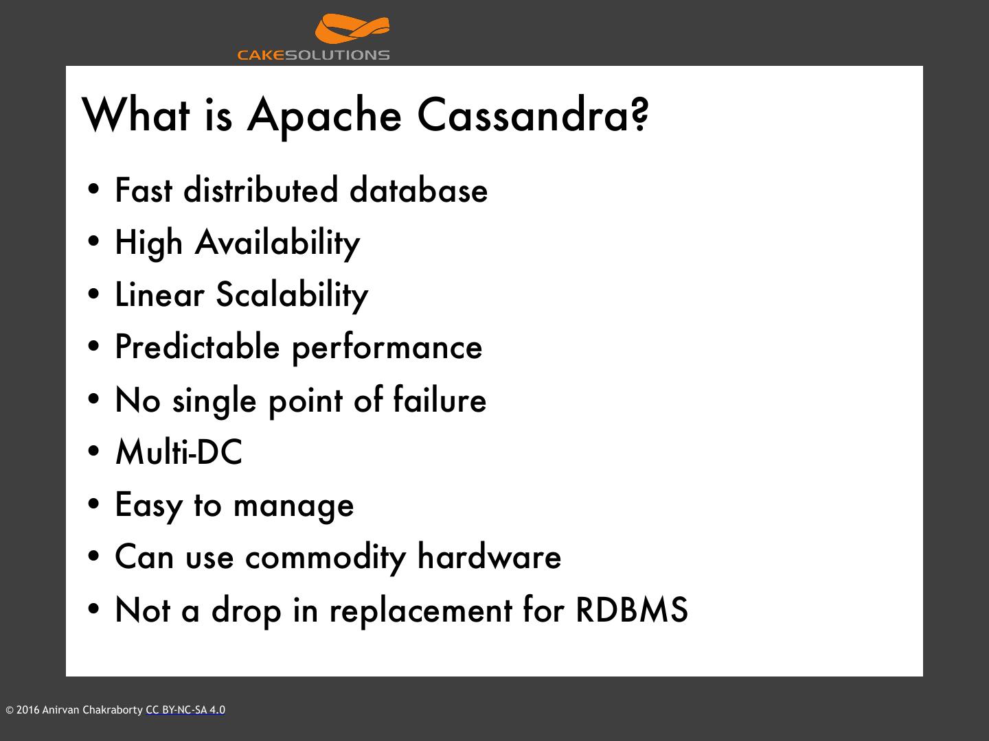 11 . What is Apache Cassandra? • Fast distributed database • High Availability • Linear Scalability • Predictable performance • No single point of failure • Multi-DC • Easy to manage • Can use commodity hardware • Not a drop in replacement for RDBMS © 2016 Anirvan Chakraborty CC BY-NC-SA 4.0