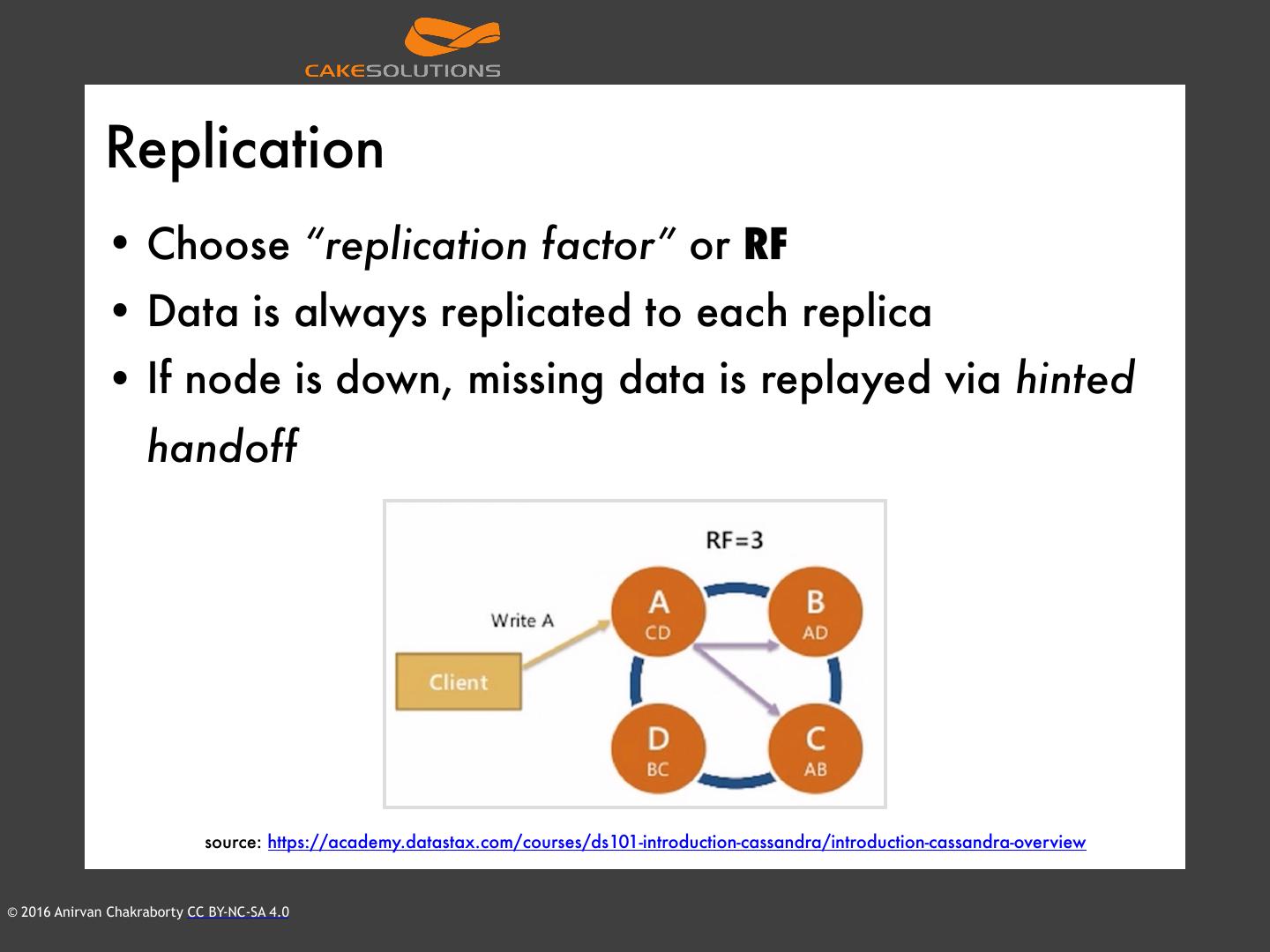 14 . Replication • Choose “replication factor” or RF • Data is always replicated to each replica • If node is down, missing data is replayed via hinted handoff source: https://academy.datastax.com/courses/ds101-introduction-cassandra/introduction-cassandra-overview © 2016 Anirvan Chakraborty CC BY-NC-SA 4.0