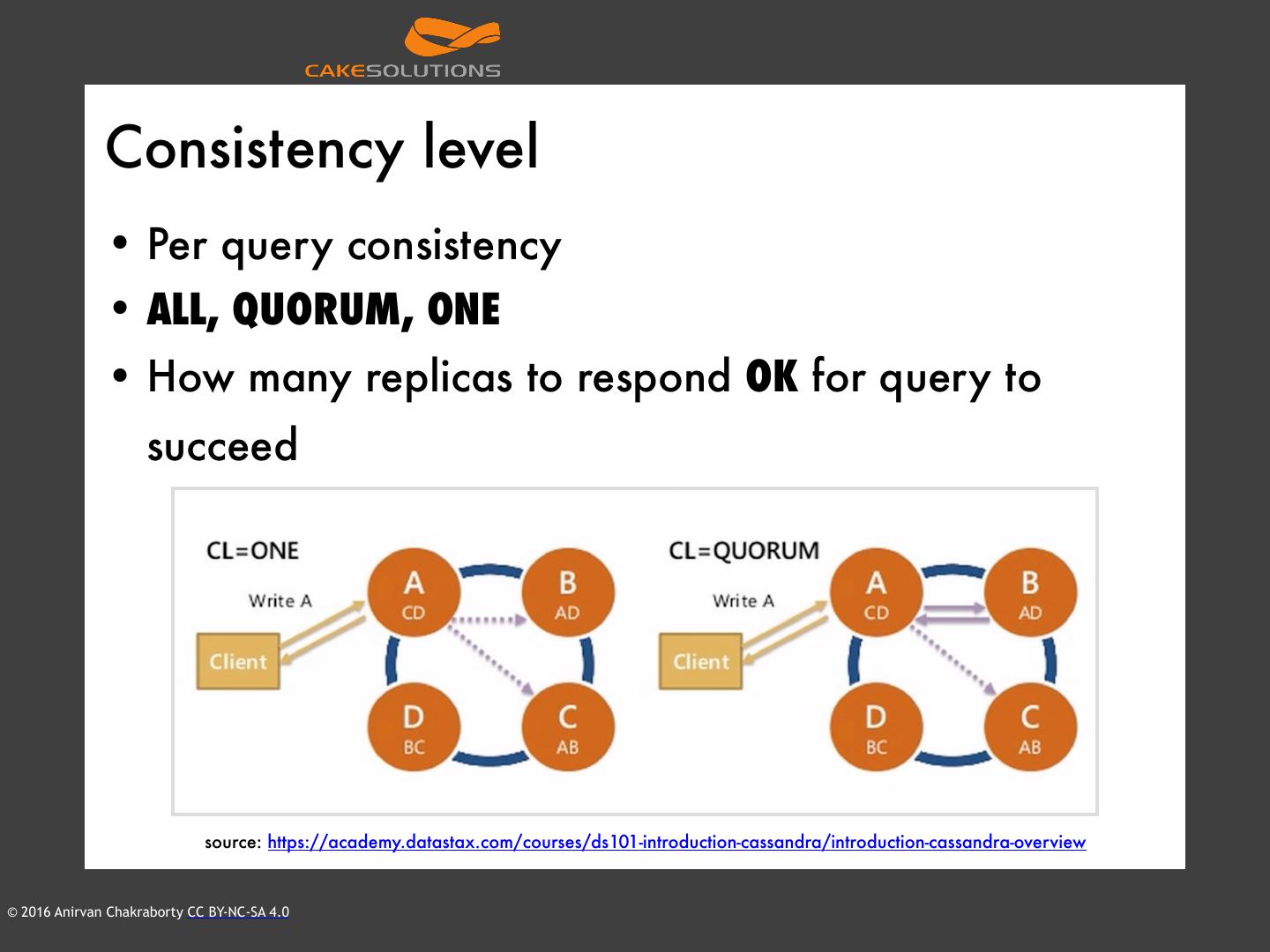 15 . Consistency level • Per query consistency • ALL, QUORUM, ONE • How many replicas to respond OK for query to succeed source: https://academy.datastax.com/courses/ds101-introduction-cassandra/introduction-cassandra-overview © 2016 Anirvan Chakraborty CC BY-NC-SA 4.0