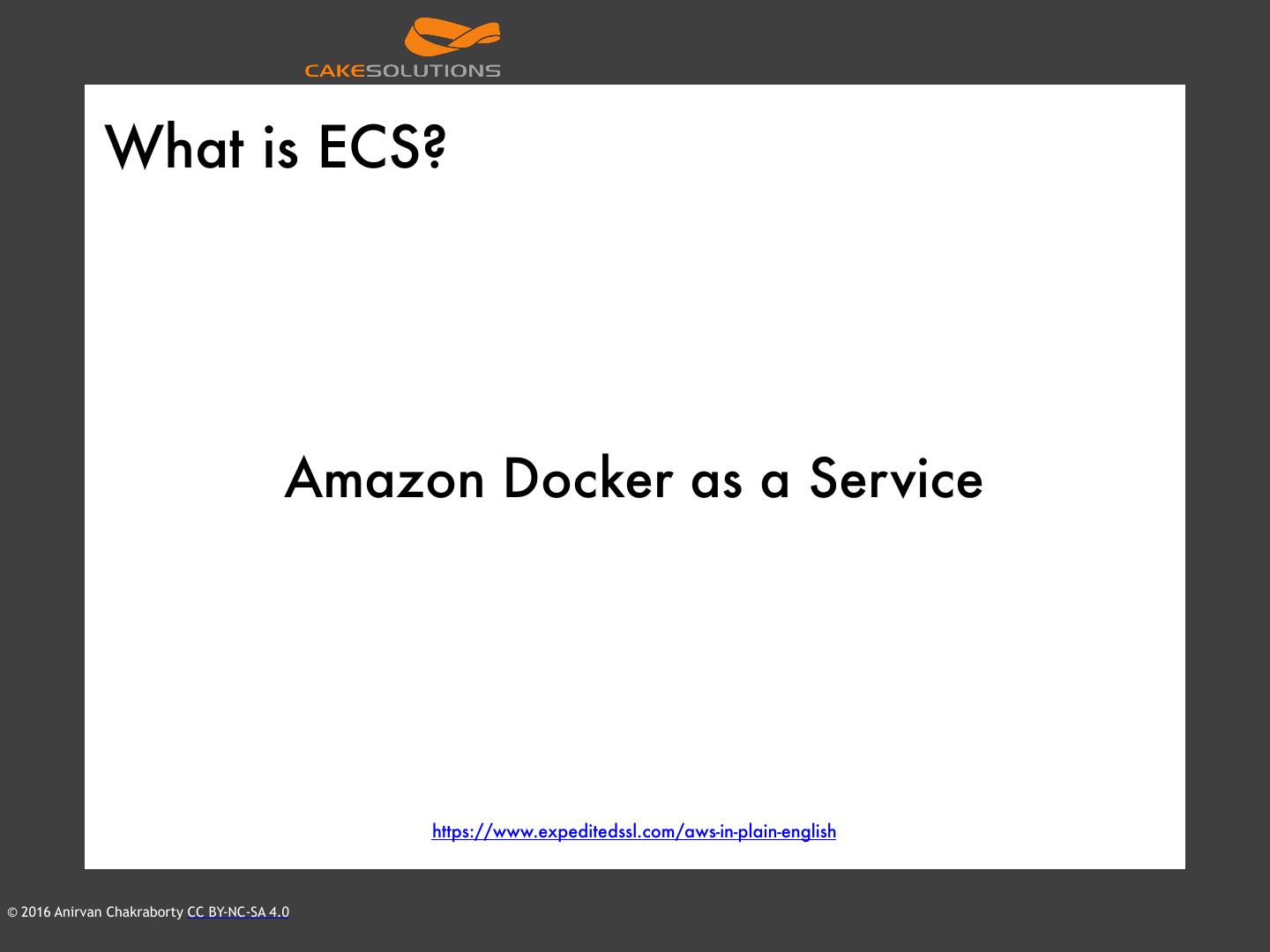 21 . What is ECS? Amazon Docker as a Service https://www.expeditedssl.com/aws-in-plain-english © 2016 Anirvan Chakraborty CC BY-NC-SA 4.0