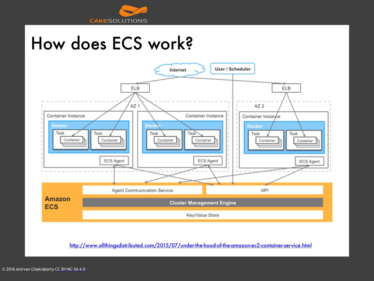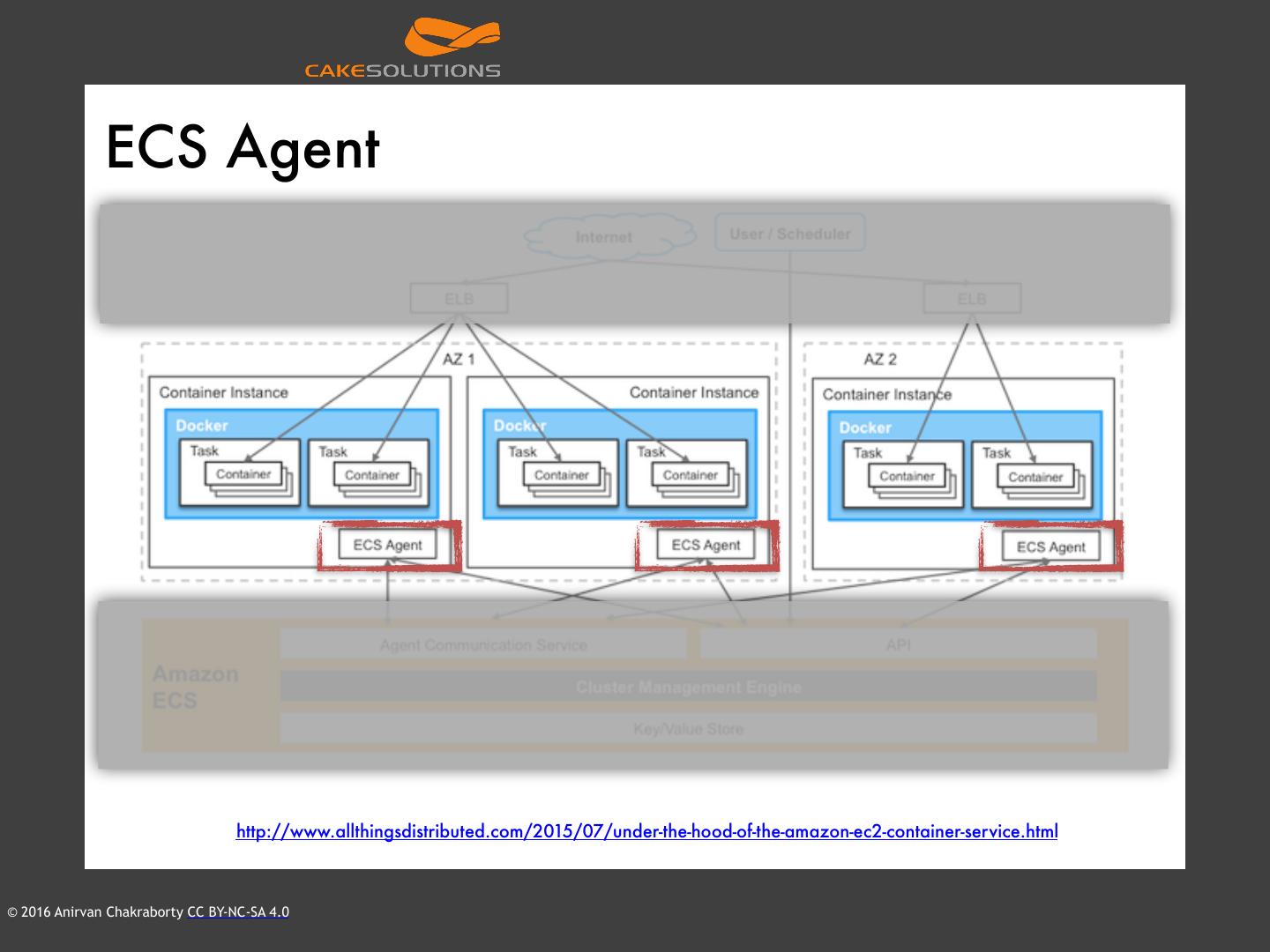25 . ECS Agent http://www.allthingsdistributed.com/2015/07/under-the-hood-of-the-amazon-ec2-container-service.html © 2016 Anirvan Chakraborty CC BY-NC-SA 4.0