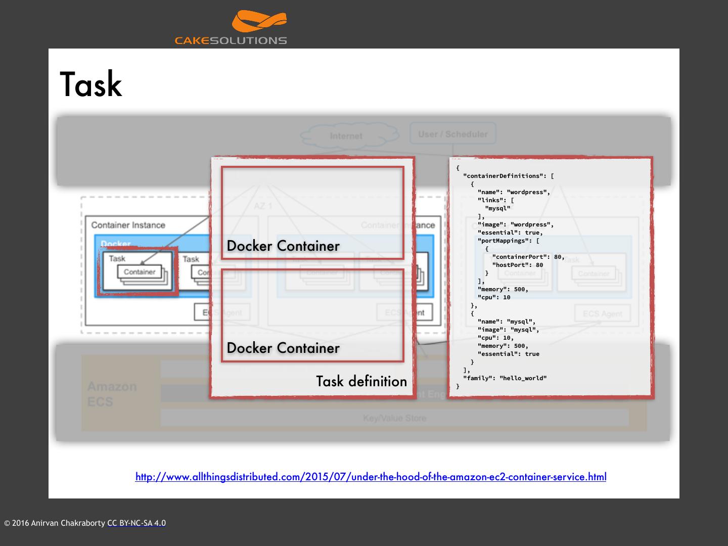 27 . Task { "containerDefinitions": [ { "name": "wordpress", "links": [ "mysql" ], "image": "wordpress", "essential": true, Docker Container "portMappings": [ { "containerPort": 80, "hostPort": 80 } ], "memory": 500, "cpu": 10 }, { "name": "mysql", "image": "mysql", "cpu": 10, Docker Container "memory": 500, "essential": true } ], Task definition } "family": "hello_world" http://www.allthingsdistributed.com/2015/07/under-the-hood-of-the-amazon-ec2-container-service.html © 2016 Anirvan Chakraborty CC BY-NC-SA 4.0