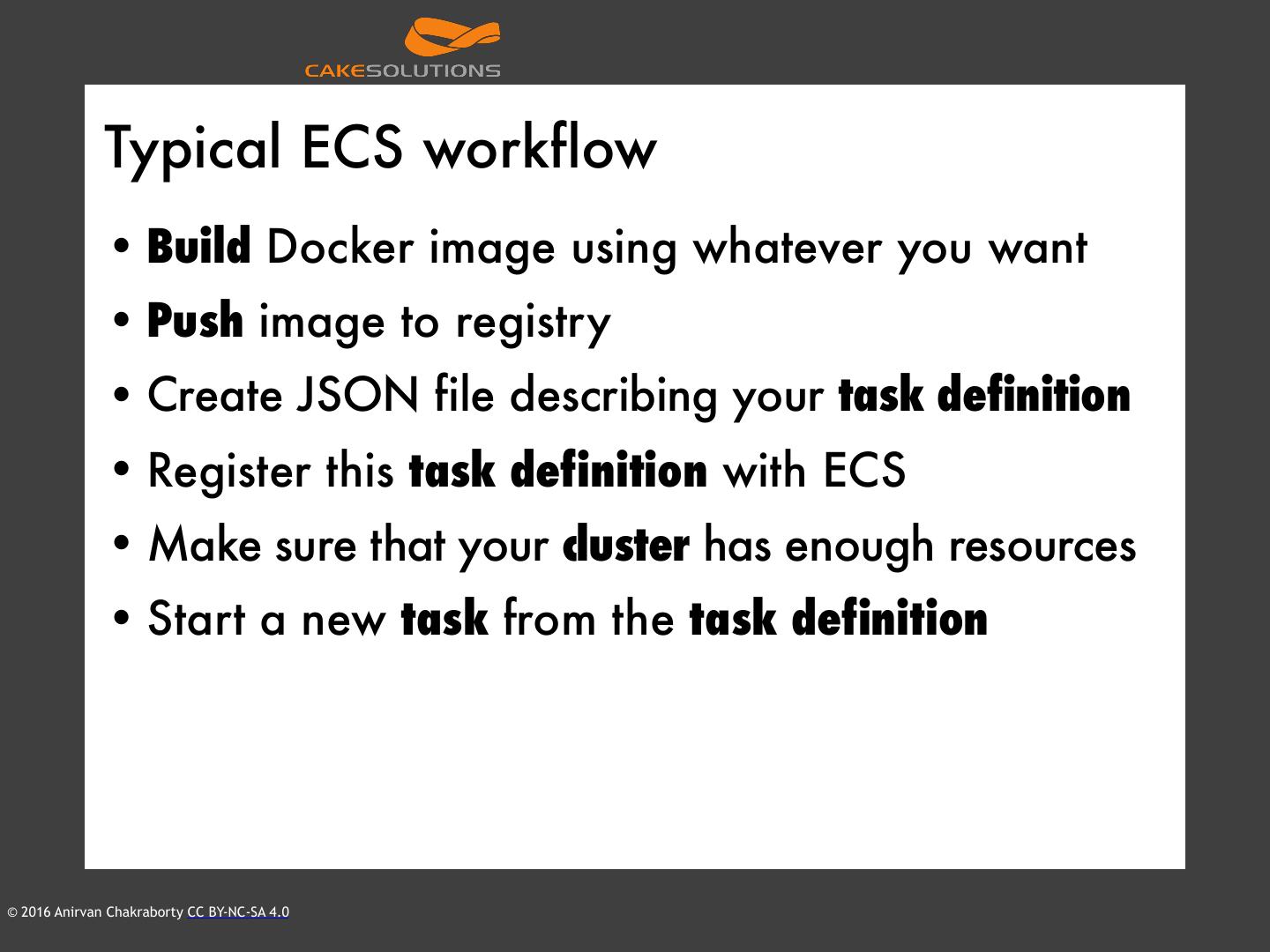 20 . What is ECS? …is a highly scalable, fast, container management service that makes it easy to run, stop, and manage Docker containers on a cluster of Amazon EC2 instances. http://docs.aws.amazon.com/AmazonECS/latest/developerguide/Welcome.html © 2016 Anirvan Chakraborty CC BY-NC-SA 4.0