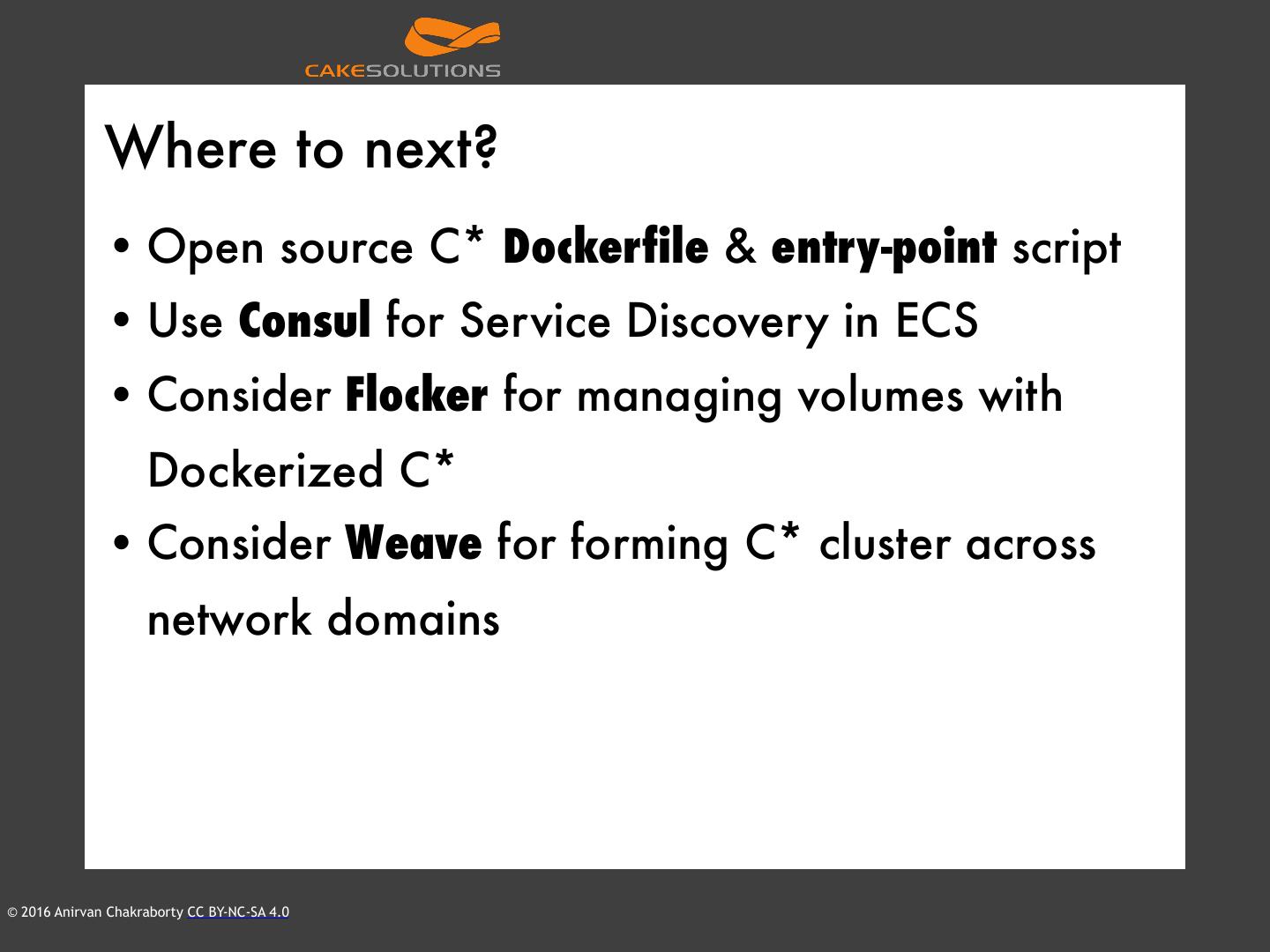 17 . Dockerize C* Dev Environment • Make it run as slow, but as stable as possible! • Super low memory settings in cassandra-env.sh • MAX_HEAP_SIZE=“128M” • HEAP_NEWSIZE=“24M” • Remove caches in dev mode in cassandra.yml • key_cache_size_in_mb: 0 • reduce_cache_sizes_at: 0 • reduce_cache_capacity_to: 0 © 2016 Anirvan Chakraborty CC BY-NC-SA 4.0