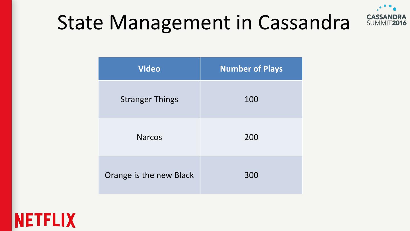 29 .State Management in Cassandra Video Number of Plays Stranger Things 100 Narcos 200 Orange is the new Black 300