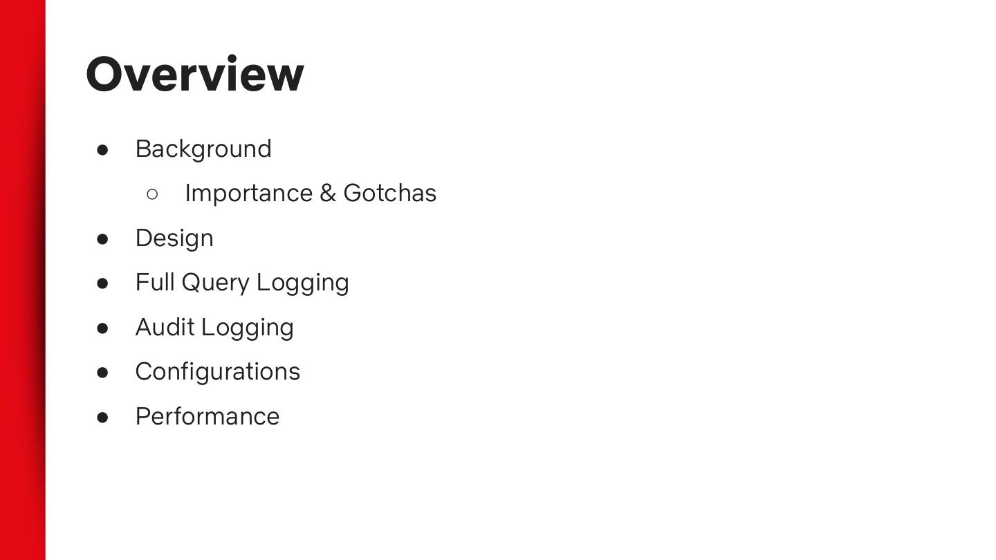 7 .Overview ● Background ○ Importance & Gotchas ● Design ● Full Query Logging ● Audit Logging ● Configurations ● Performance