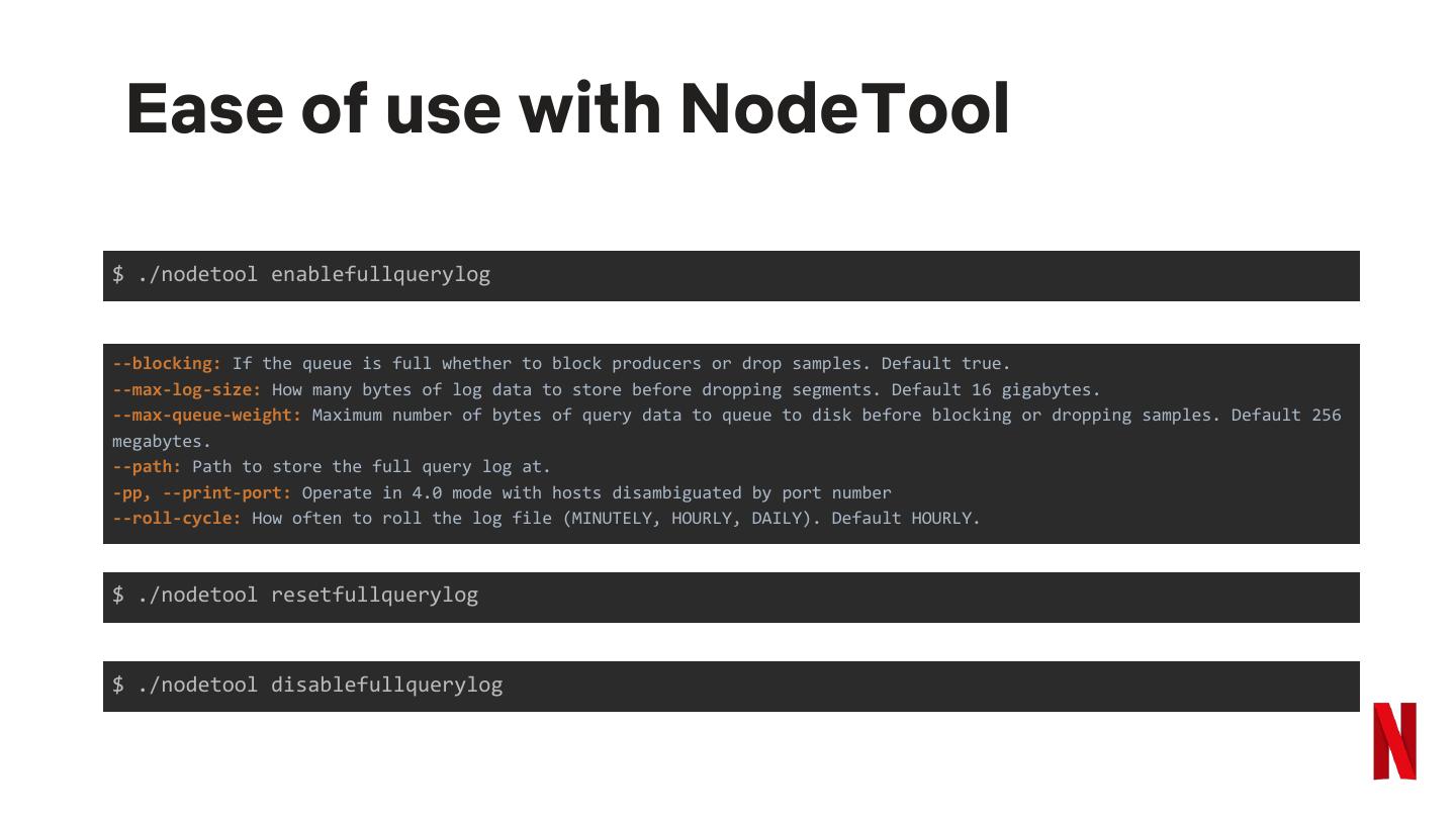 19 . Ease of use with NodeTool $ ./nodetool enablefullquerylog --blocking: If the queue is full whether to block producers or drop samples. Default true. --max-log-size: How many bytes of log data to store before dropping segments. Default 16 gigabytes. --max-queue-weight: Maximum number of bytes of query data to queue to disk before blocking or dropping samples. Default 256 megabytes. --path: Path to store the full query log at. -pp, --print-port: Operate in 4.0 mode with hosts disambiguated by port number --roll-cycle: How often to roll the log file (MINUTELY, HOURLY, DAILY). Default HOURLY. $ ./nodetool resetfullquerylog $ ./nodetool disablefullquerylog