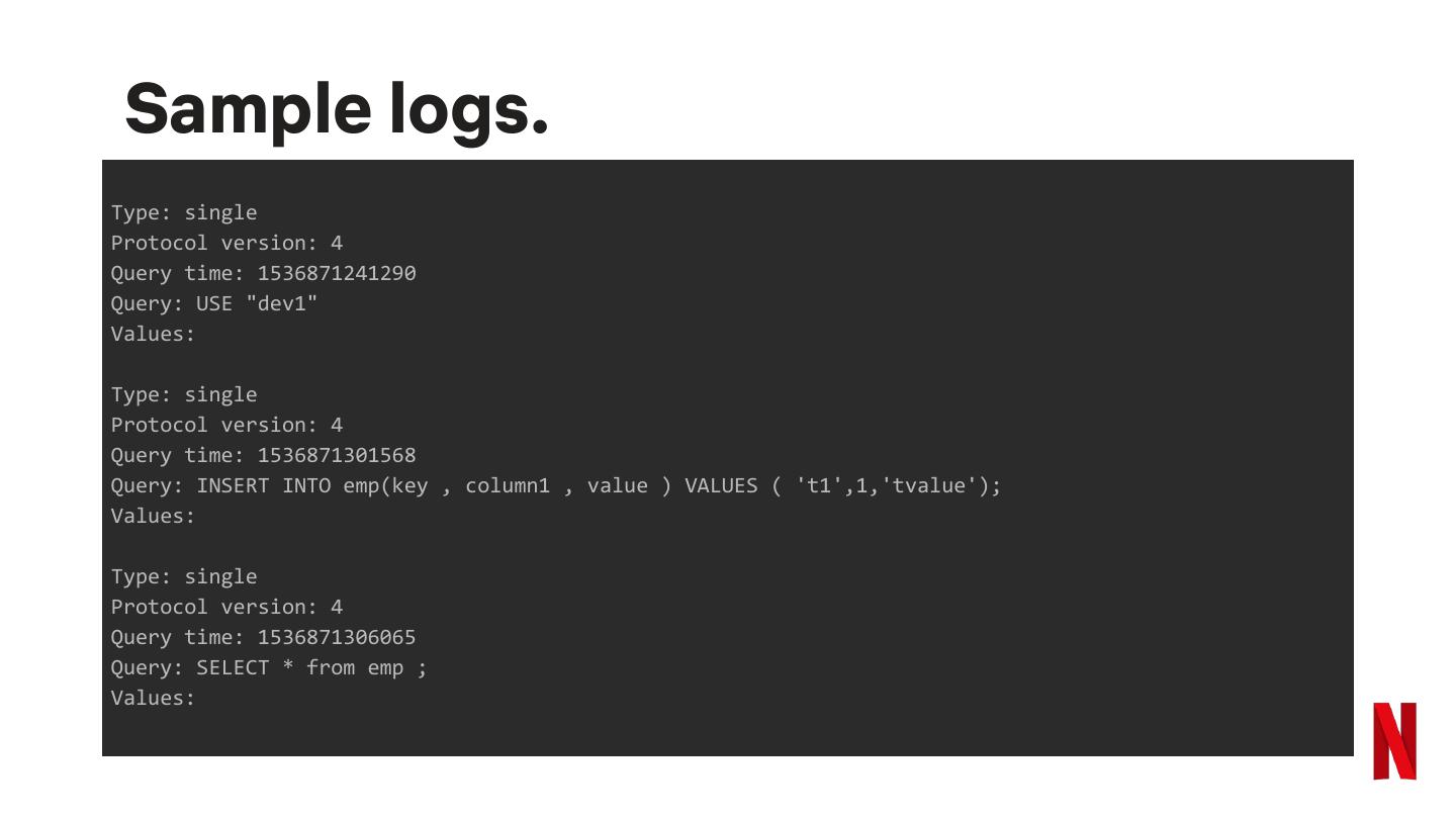 20 . Sample logs. Type: single Protocol version: 4 Query time: 1536871241290 Query: USE "dev1" Values: Type: single Protocol version: 4 Query time: 1536871301568 Query: INSERT INTO emp(key , column1 , value ) VALUES ( 't1',1,'tvalue'); Values: Type: single Protocol version: 4 Query time: 1536871306065 Query: SELECT * from emp ; Values: