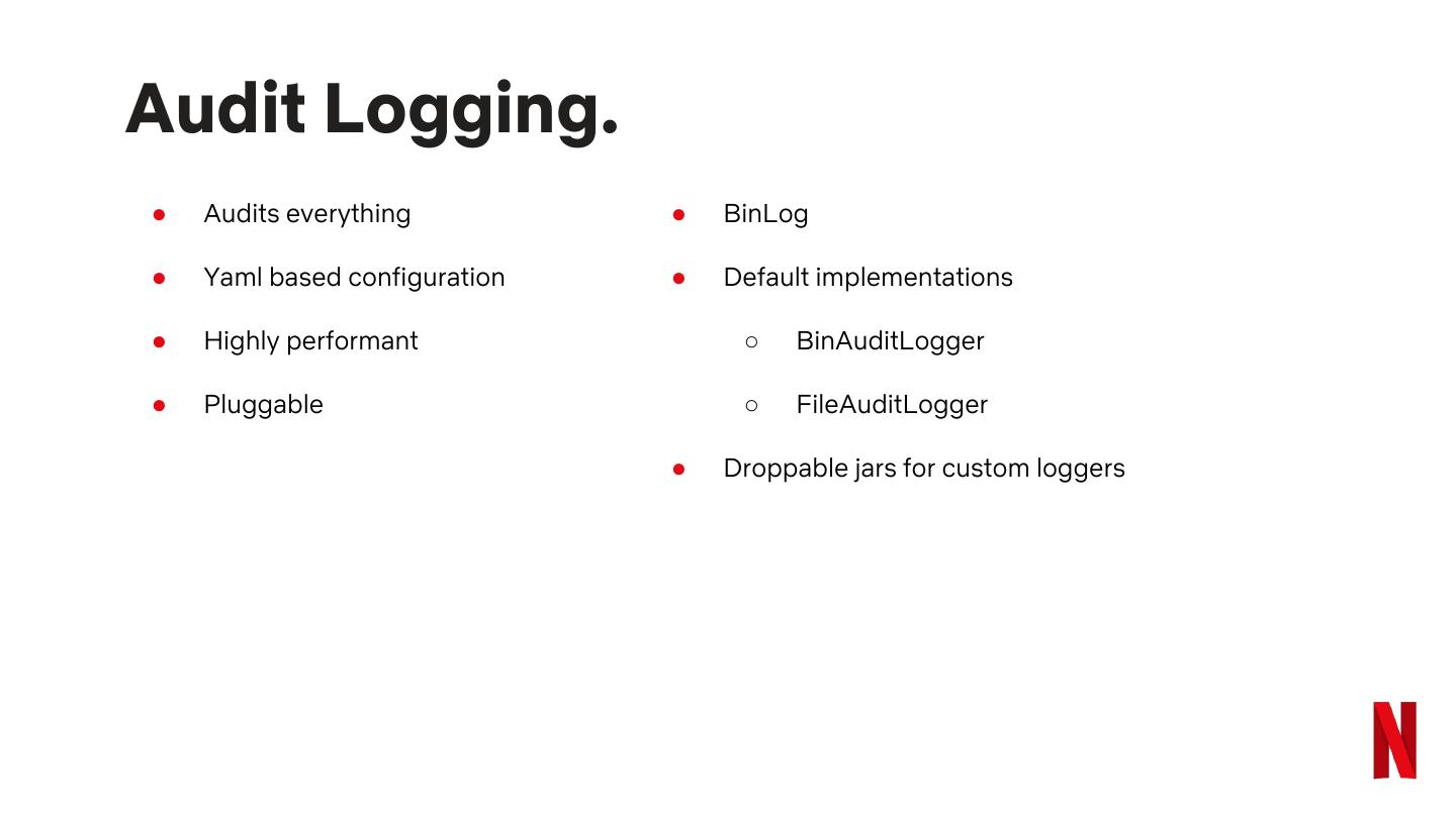 22 .Audit Logging. ● Audits everything ● BinLog ● Yaml based configuration ● Default implementations ● Highly performant ○ BinAuditLogger ● Pluggable ○ FileAuditLogger ● Droppable jars for custom loggers