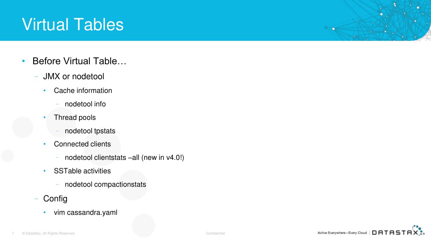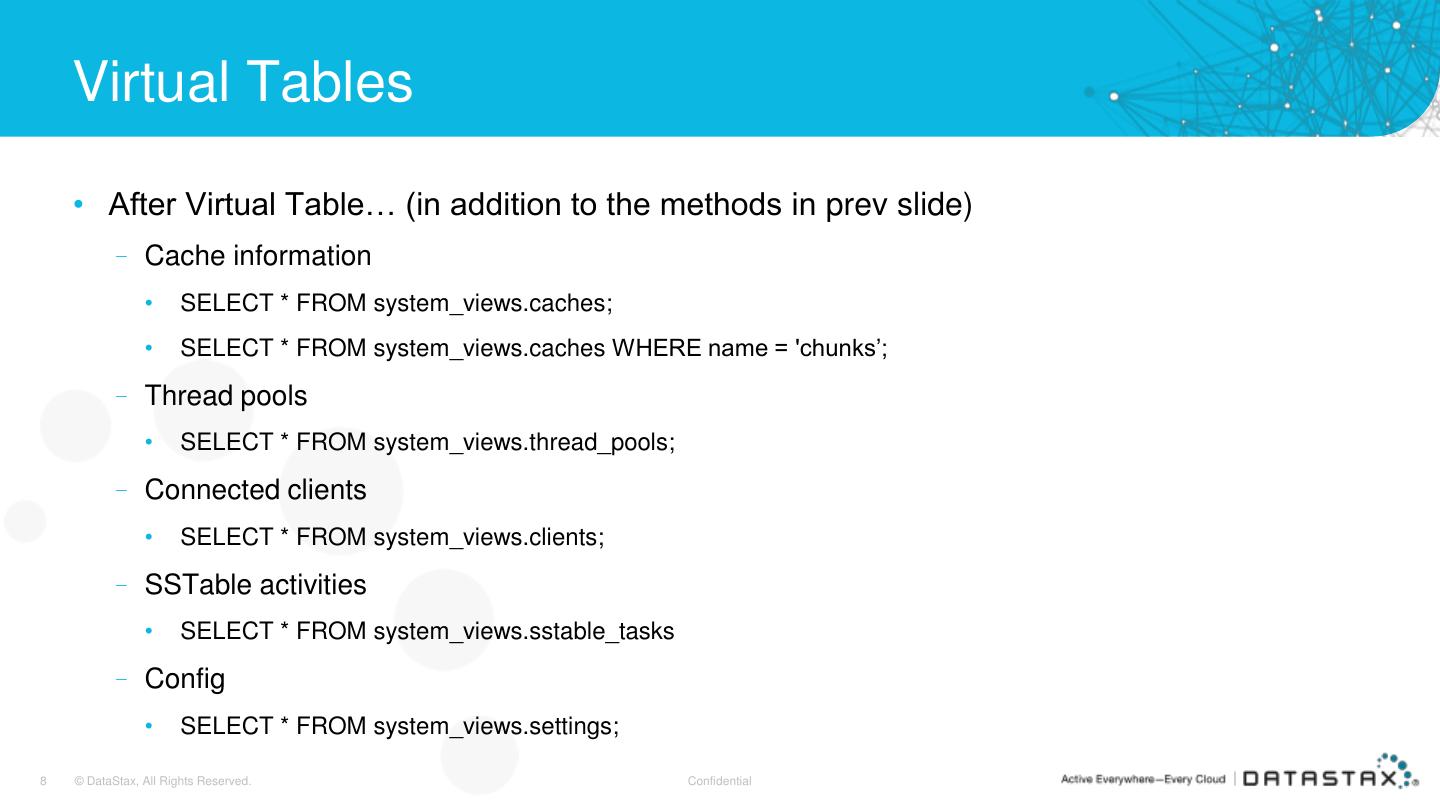 7 . Virtual Tables • Before Virtual Table… – JMX or nodetool • Cache information – nodetool info • Thread pools – nodetool tpstats • Connected clients – nodetool clientstats –all (new in v4.0!) • SSTable activities – nodetool compactionstats – Config • vim cassandra.yaml 7 © DataStax, All Rights Reserved. Confidential