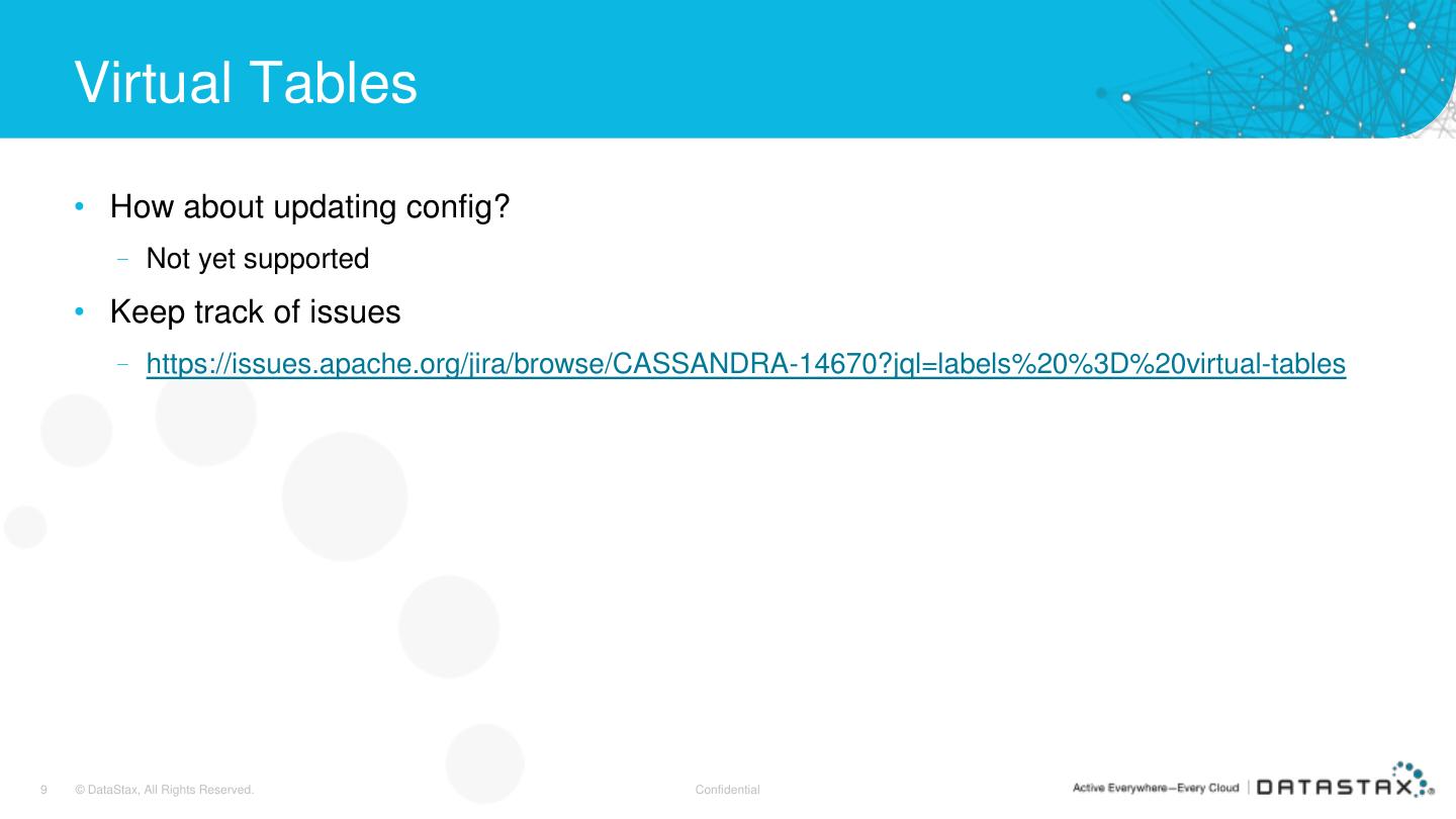 9 . Virtual Tables • How about updating config? – Not yet supported • Keep track of issues – https://issues.apache.org/jira/browse/CASSANDRA-14670?jql=labels%20%3D%20virtual-tables 9 © DataStax, All Rights Reserved. Confidential