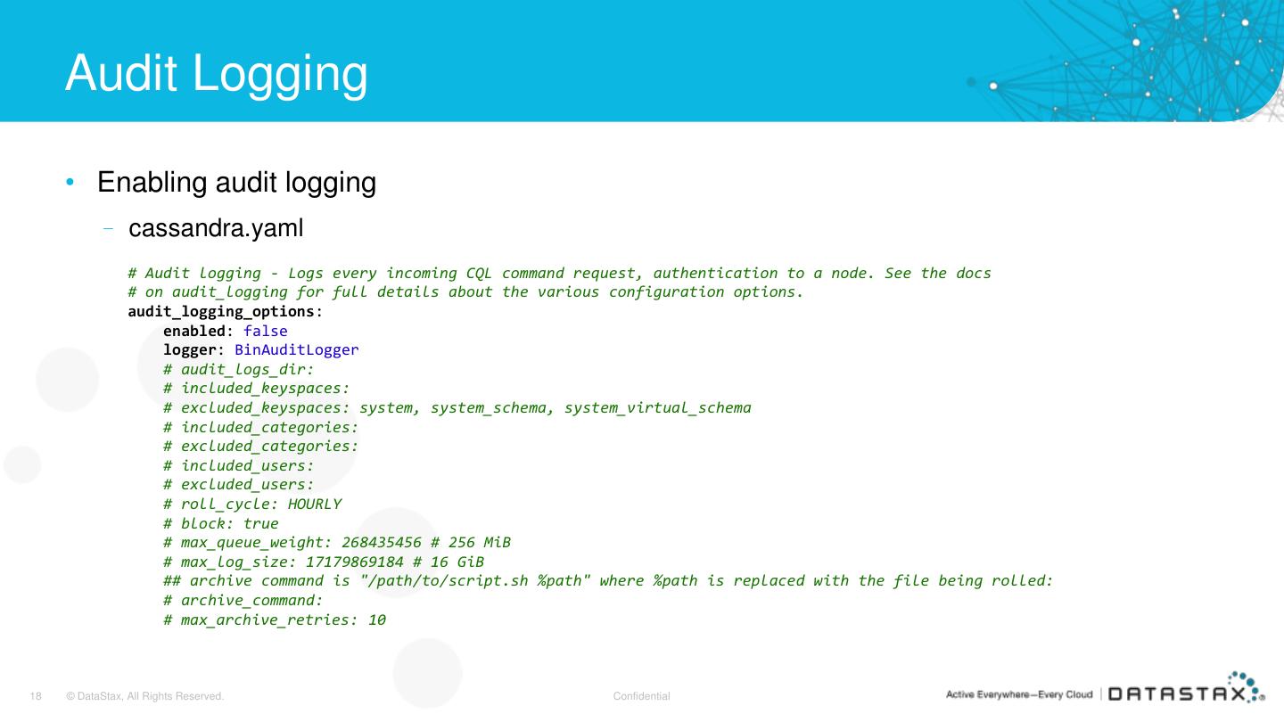 17 . Audit Logging • Log queries / authentication to a node for auditing • When audit events are logged? – After executing CQL / Authentication, before sending response • Pluggable logger (IAuditLogger interface) to publish audit event anywhere – BinAuditLogger (default) – binary log – FileAuditLogger – logback • Audit log includes: – User, Client IP, timestamp, category, operation, … • See https://cassandra.apache.org/doc/latest/operating/audit_logging.html 17 © DataStax, All Rights Reserved. Confidential