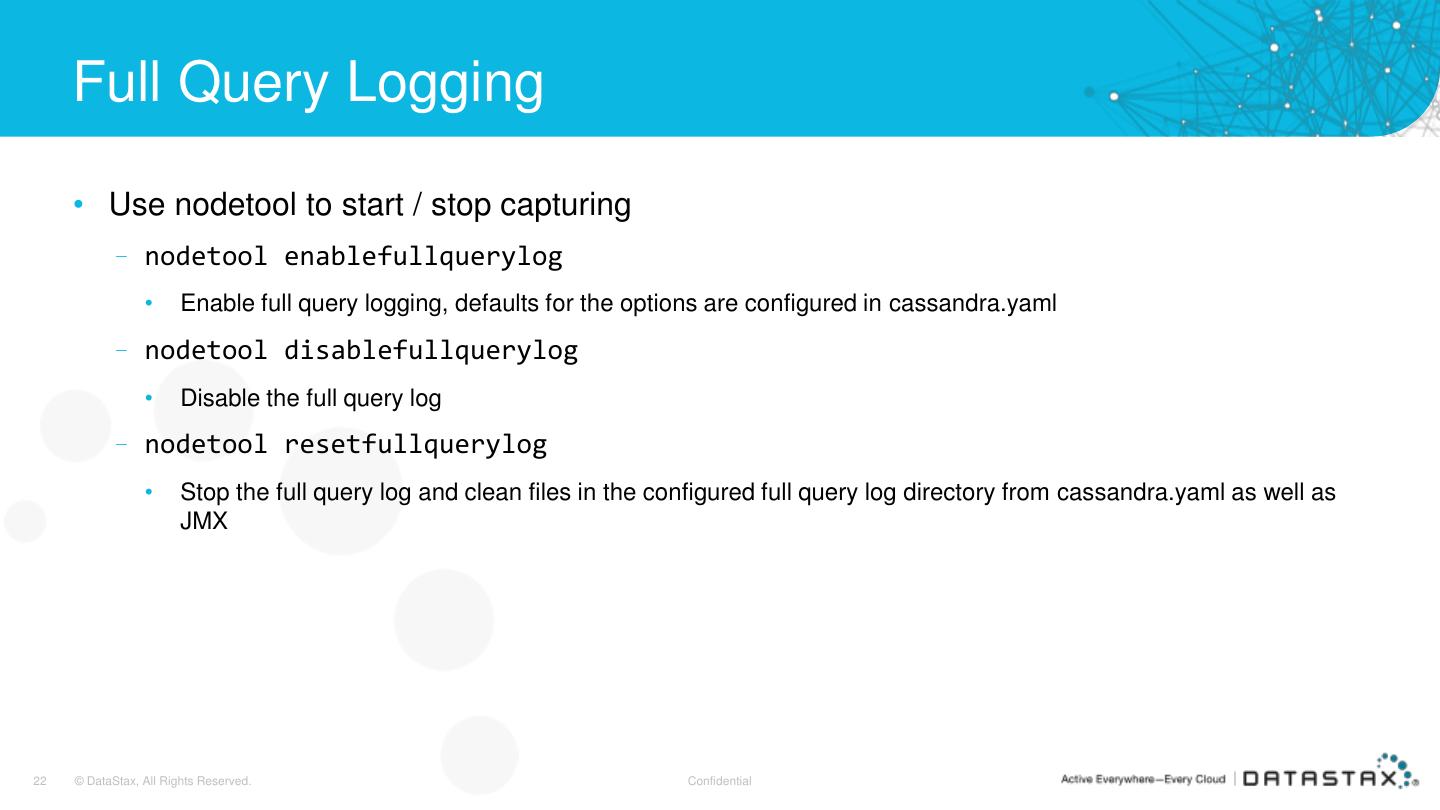 22 . Full Query Logging • Use nodetool to start / stop capturing – nodetool enablefullquerylog • Enable full query logging, defaults for the options are configured in cassandra.yaml – nodetool disablefullquerylog • Disable the full query log – nodetool resetfullquerylog • Stop the full query log and clean files in the configured full query log directory from cassandra.yaml as well as JMX 22 © DataStax, All Rights Reserved. Confidential