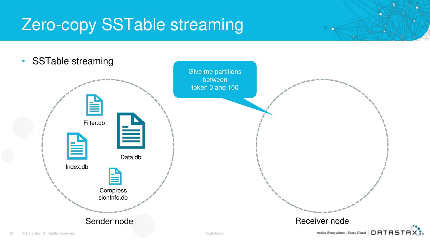 24 . Zero-copy SSTable streaming • SSTable streaming Give me partitions between token 0 and 100 Filter.db Data.db Index.db Compress sionInfo.db Sender node Receiver node 24 © DataStax, All Rights Reserved. Confidential