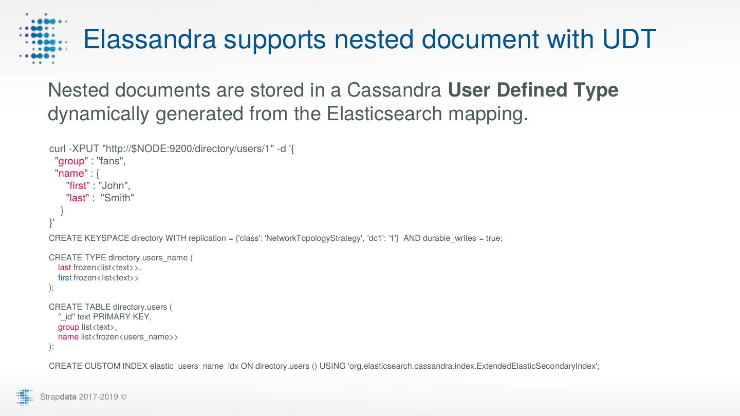 11 . Elassandra supports nested document with UDT Nested documents are stored in a Cassandra User Defined Type dynamically generated from the Elasticsearch mapping. curl -XPUT "http://$NODE:9200/directory/users/1" -d '{ "group" : "fans", "name" : { "first" : "John", "last" : "Smith" } }' CREATE KEYSPACE directory WITH replication = {'class': 'NetworkTopologyStrategy', 'dc1': '1'} AND durable_writes = true; CREATE TYPE directory.users_name ( last frozen<list<text>>, first frozen<list<text>> ); CREATE TABLE directory.users ( "_id" text PRIMARY KEY, group list<text>, name list<frozen<users_name>> ); CREATE CUSTOM INDEX elastic_users_name_idx ON directory.users () USING 'org.elasticsearch.cassandra.index.ExtendedElasticSecondaryIndex'; Strapdata 2017-2019 ©