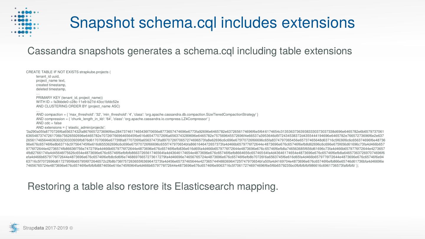 14 . Snapshot schema.cql includes extensions Cassandra snapshots generates a schema.cql including table extensions CREATE TABLE IF NOT EXISTS strapkube.projects ( tenant_id uuid, project_name text, created timestamp, deleted timestamp, … PRIMARY KEY (tenant_id, project_name)) WITH ID = fa3bbde0-c28c-11e9-b27d-43cc1bfdc52e AND CLUSTERING ORDER BY (project_name ASC) … AND compaction = { 'max_threshold': '32', 'min_threshold': '4', 'class': 'org.apache.cassandra.db.compaction.SizeTieredCompactionStrategy' } AND compression = { 'chunk_length_in_kb': '64', 'class': 'org.apache.cassandra.io.compress.LZ4Compressor' } AND cdc = false AND extensions = { ‘elastic_admin/projects': '3a290a05fa8770726f6a65637432fa8676657273696f6ec2847374617465436f70656e8773657474696e6773fa92696e6465782e6372656174696f6e5f64 6174654c313536373639383330373037338d696e6465782e6b6579737061 63654873747261706b75626592696e6465782e70726f76696465645f6e616d654770726f6a6563743289696e6465782e757569645572696f4e66537a3953646d5f72434538372d4355444194696e6465782e76657273696f6e2e637 265617465644636303230333939fb876d617070696e6773f8fa8770726f6a65637473fa8970726f70657274696573fa8e62696c6c696e675f70726f66696c65fa8374797065456e65737465648d63716c5f636f6c6c656374696f6e48736 96e676c65746f6e8b63716c5f7564745f6e616d655362696c6c696e675f70726f66696c655f747970654bfa8661646472657373fa4d466b6579776f72644e 4873696e676c65746f6efb8d62696c6c696e675f656d61696c73fa4d466b657 9776f72644e42736574fb86636f756e747279fa4d466b6579776f72644e4873696e676c65746f6efb836e616d65fa4d466b6579776f72644e4873696e676c 65746f6efb8a746563685f656d61696c73fa4d466b6579776f72644e4273657 4fb82766174fa4d45646f75626c654e4873696e676c65746f6efbfbfb8663726561746564fa4d43646174654e4873696e676c65746f6efb8664656c657465 64fa4d43646174654e4873696e676c65746f6efb8a6465736372697074696f6 efa4d466b6579776f72644e4873696e676c65746f6efb8c6d6f6e74686976657273617279fa4d46696e74656765724e4873696e676c65746f6efb8b70726f 6a6563745f6e616d65fa4d466b6579776f72644e4873696e676c65746f6e94 63716c5f7072696d6172795f6b65795f6f72646572c2fb8b736f757263655f6369647273fa4d456e65737465644e427365744f48636964725f747970654bf a50fa4d4169704e4873696e676c65746f6efb866e65746d61736bfa4d46696e 74656765724e4873696e676c65746f6efbfbfb8874656e616e745f6964fa4d466b6579776f72644e4873696e676c65746f6e9063716c5f706172746974696f6e5f6b6579235bc0fbfbfbfbf986616c6961736573fafbfbfb' }; Restoring a table also restore its Elasticsearch mapping. Strapdata 2017-2019 ©