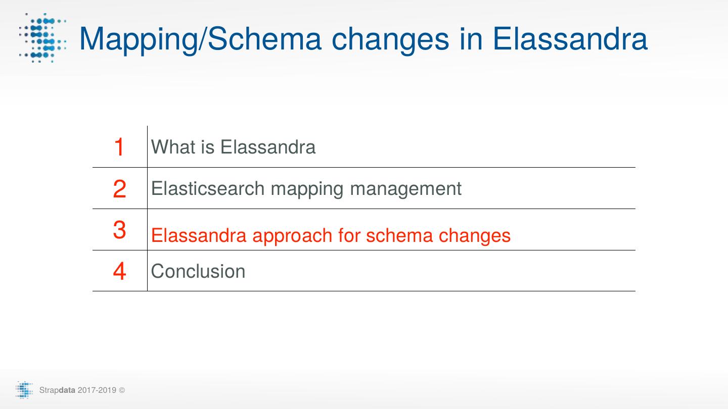 2 . Mapping/Schema changes in Elassandra 1 What is Elassandra 2 Elasticsearch mapping management 3 Elassandra approach for schema changes 4 Conclusion Strapdata 2017-2019 ©