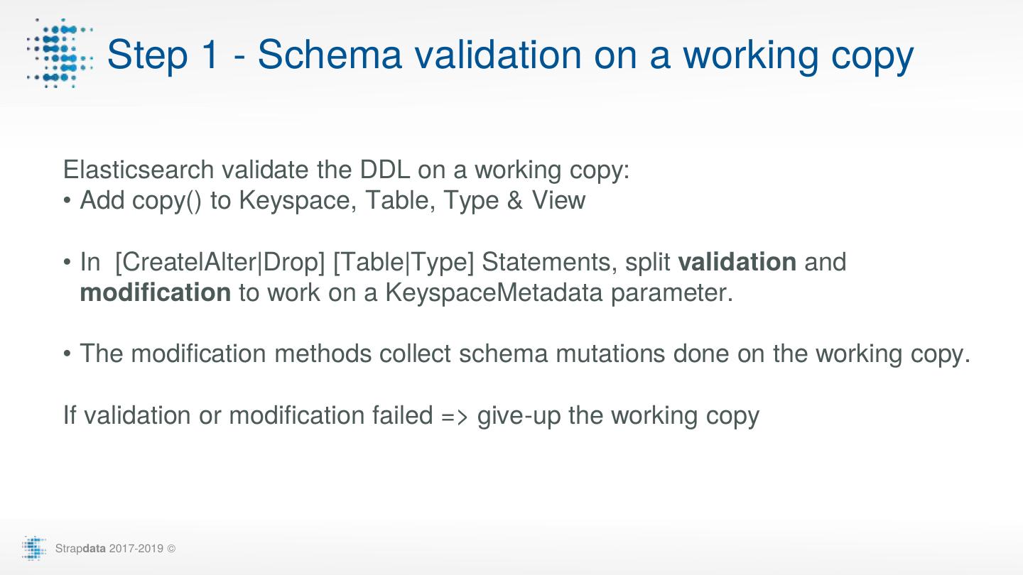 20 . Step 1 - Schema validation on a working copy Elasticsearch validate the DDL on a working copy: • Add copy() to Keyspace, Table, Type & View • In [CreatelAlter|Drop] [Table|Type] Statements, split validation and modification to work on a KeyspaceMetadata parameter. • The modification methods collect schema mutations done on the working copy. If validation or modification failed => give-up the working copy Strapdata 2017-2019 ©