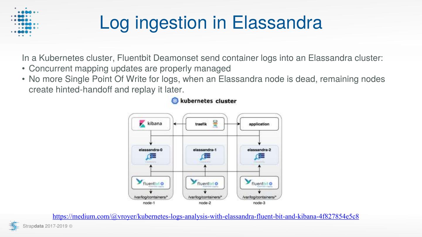 29 . Log ingestion in Elassandra In a Kubernetes cluster, Fluentbit Deamonset send container logs into an Elassandra cluster: • Concurrent mapping updates are properly managed • No more Single Point Of Write for logs, when an Elassandra node is dead, remaining nodes create hinted-handoff and replay it later. https://medium.com/@vroyer/kubernetes-logs-analysis-with-elassandra-fluent-bit-and-kibana-4f827854e5c8 Strapdata 2017-2019 ©