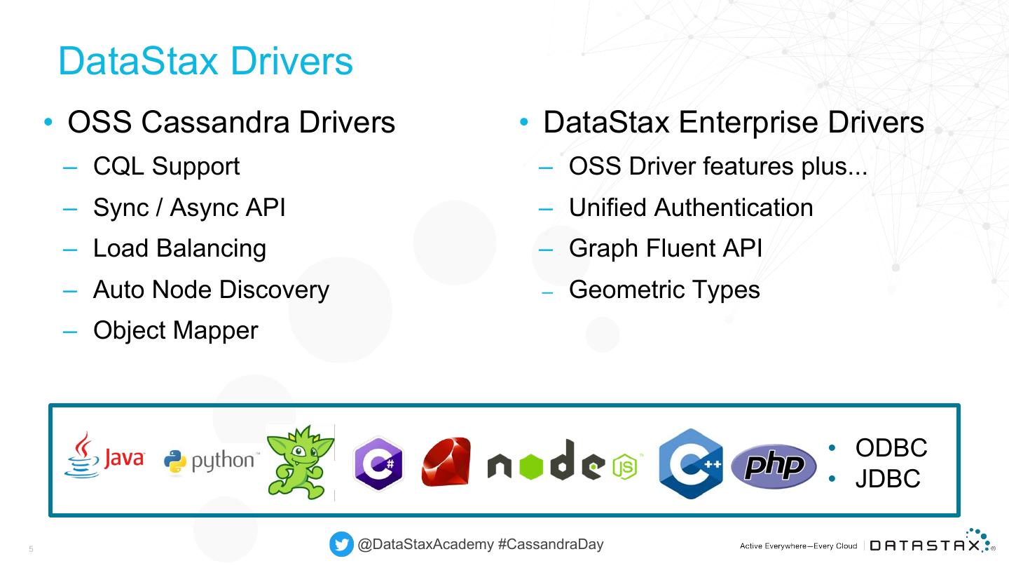 5 . DataStax Drivers • OSS Cassandra Drivers • DataStax Enterprise Drivers – CQL Support – OSS Driver features plus... – Sync / Async API – Unified Authentication – Load Balancing – Graph Fluent API – Auto Node Discovery – Geometric Types – Object Mapper • ODBC • JDBC 5 @DataStaxAcademy #CassandraDay