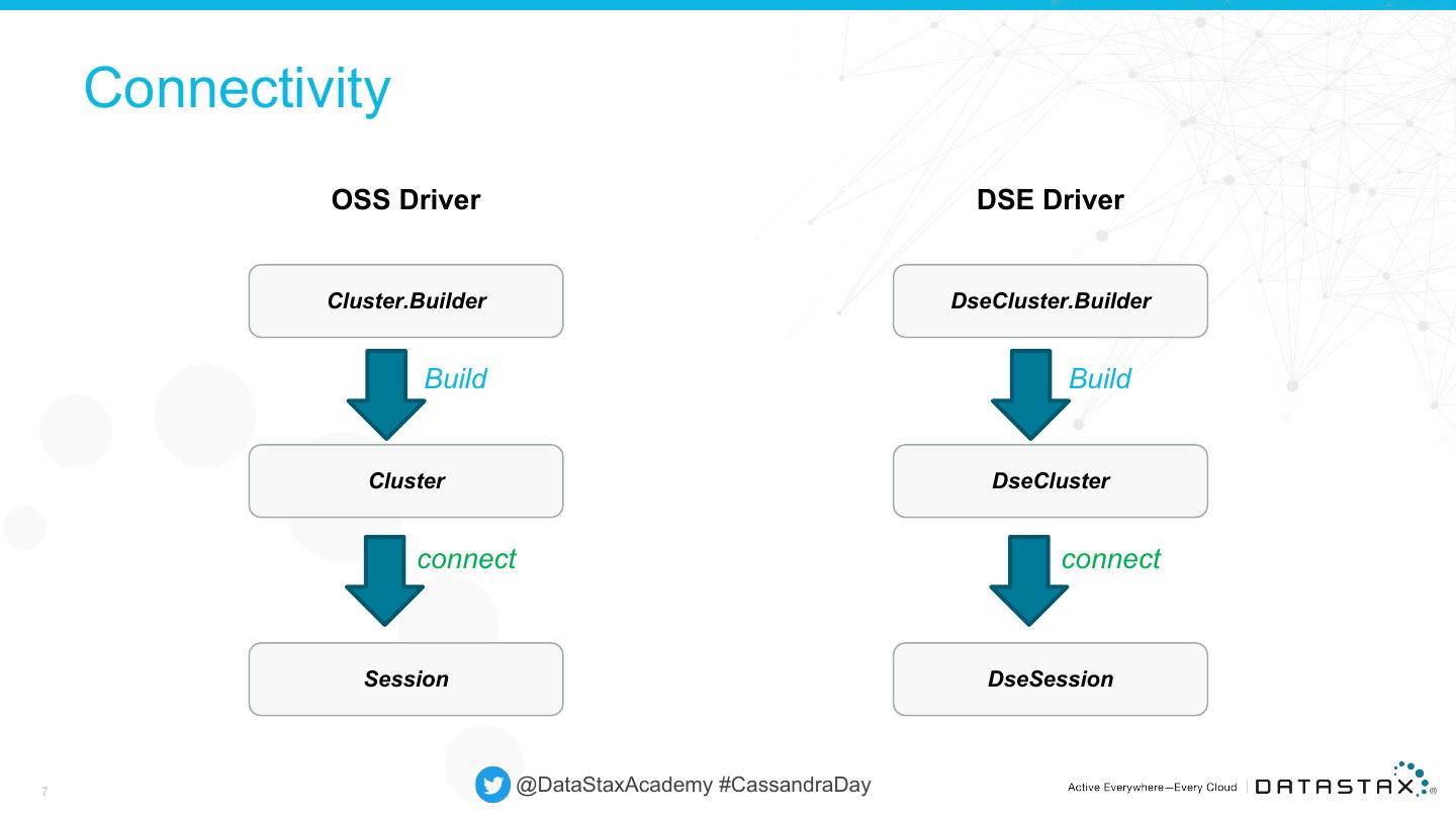 7 . Connectivity OSS Driver DSE Driver Cluster.Builder DseCluster.Builder Build Build Cluster DseCluster connect connect Session DseSession 7 @DataStaxAcademy #CassandraDay