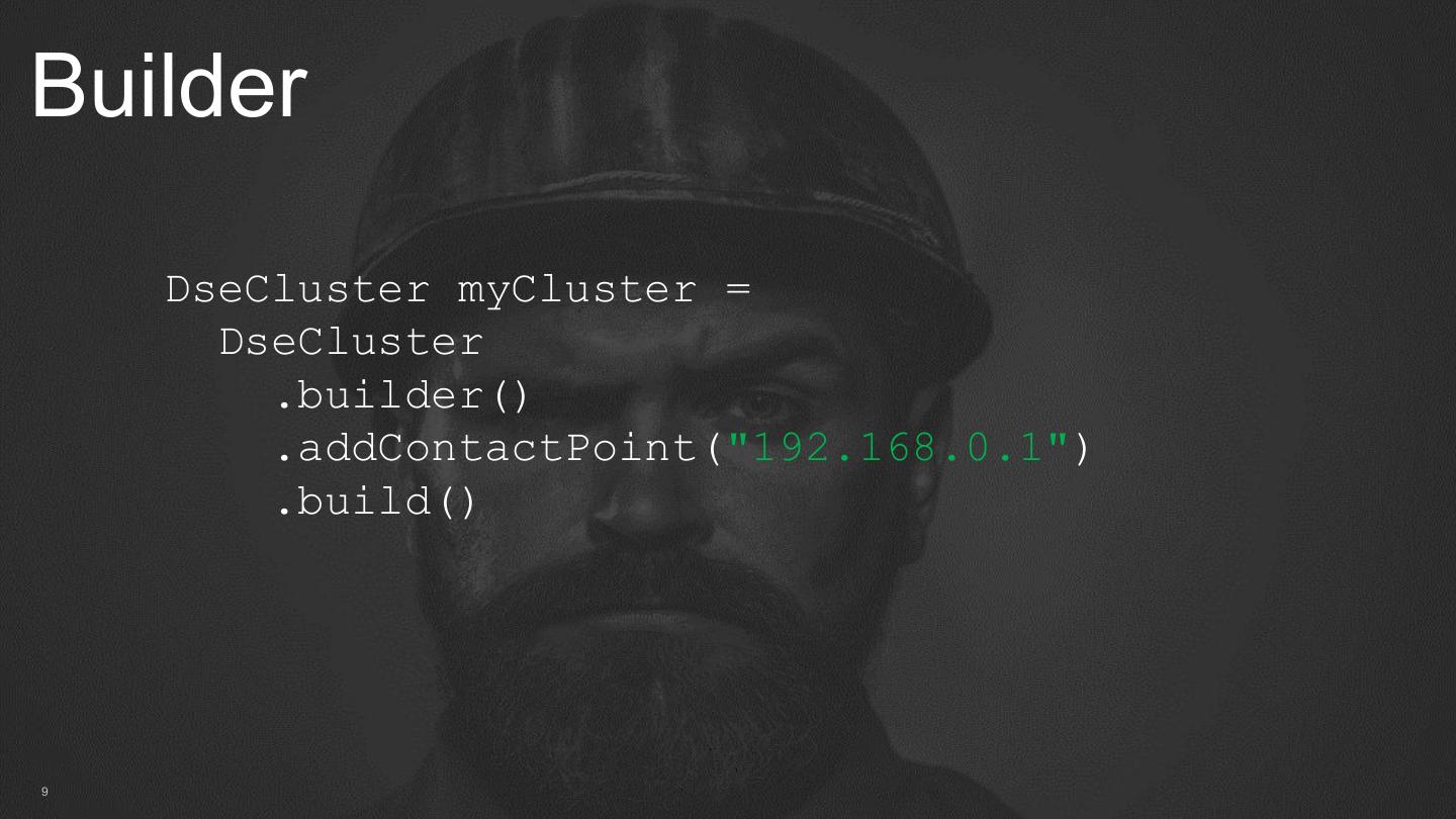 9 .Builder DseCluster myCluster = DseCluster .builder() .addContactPoint("192.168.0.1") .build() 9 @DataStaxAcademy #CassandraDay