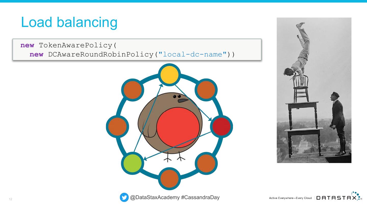 12 . Load balancing new TokenAwarePolicy( new DCAwareRoundRobinPolicy("local-dc-name")) 12 @DataStaxAcademy #CassandraDay