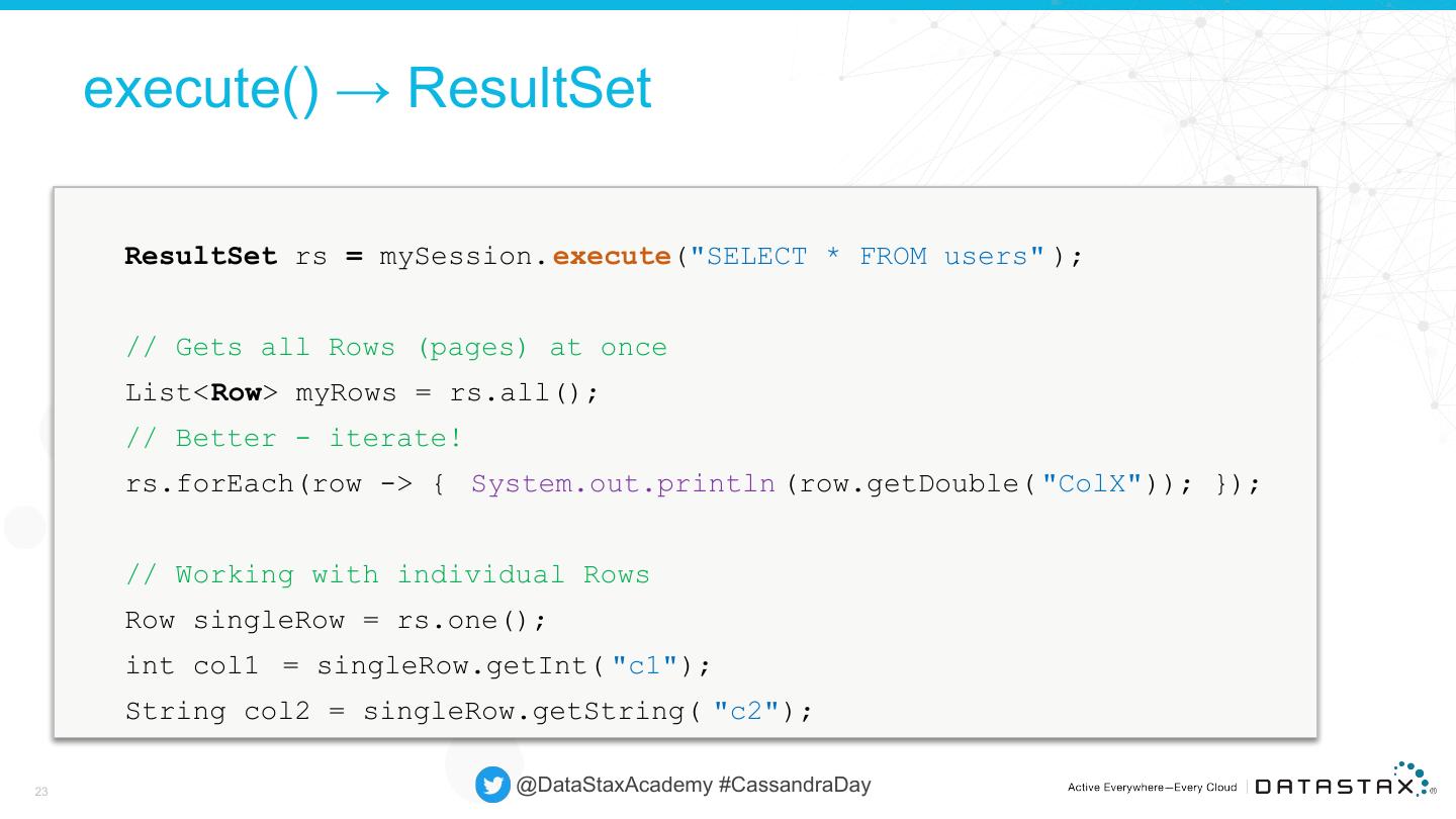 23 . execute() → ResultSet ResultSet rs = mySession. execute("SELECT * FROM users" ); // Gets all Rows (pages) at once List<Row> myRows = rs.all(); // Better - iterate! rs.forEach(row -> { System.out.println (row.getDouble( "ColX")); }); // Working with individual Rows Row singleRow = rs.one(); int col1 = singleRow.getInt( "c1"); String col2 = singleRow.getString( "c2"); 23 @DataStaxAcademy #CassandraDay