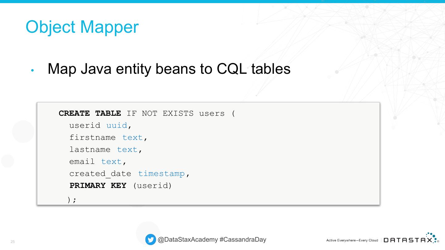 25 . Object Mapper • Map Java entity beans to CQL tables CREATE TABLE IF NOT EXISTS users ( userid uuid, firstname text, lastname text, email text, created_date timestamp, PRIMARY KEY (userid) ); 25 @DataStaxAcademy #CassandraDay
