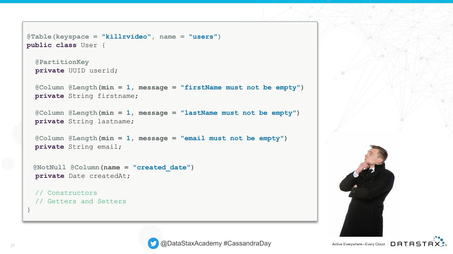 27 . @Table(keyspace = "killrvideo", name = "users") public class User { @PartitionKey private UUID userid; @Column @Length(min = 1, message = "firstName must not be empty") private String firstname; @Column @Length(min = 1, message = "lastName must not be empty") private String lastname; @Column @Length(min = 1, message = "email must not be empty") private String email; @NotNull @Column(name = "created_date") private Date createdAt; // Constructors // Getters and Setters } 27 @DataStaxAcademy #CassandraDay