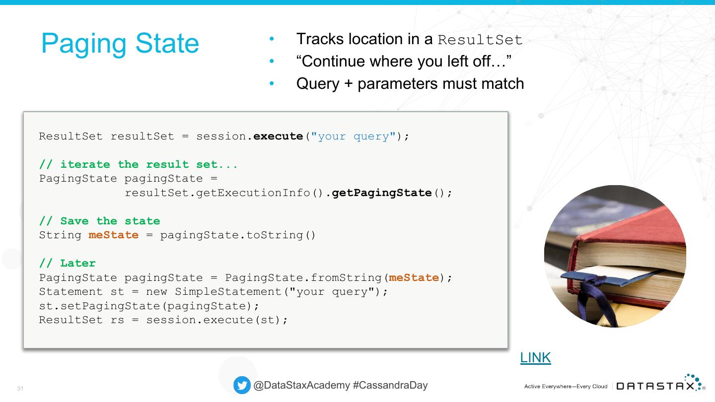 29 . Paging • Pulling large result sets all at once may not make sense • Retrieve sections or (pages) • Retrieve more…if necessary • Default of 5,000 @DataStaxAcademy #CassandraDay Paging 29
