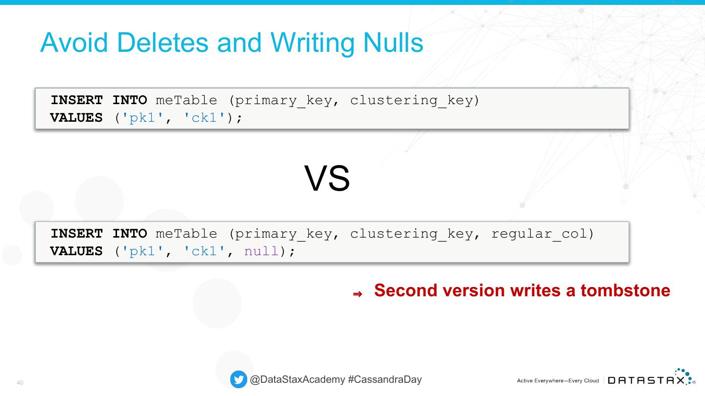 19 . Prepared and Bound Statements • Compiled once on each node automatically as needed • Prepare each statement only once per application • Use one of the many bind variations to create a BoundStatement PreparedStatement ps = session.prepare("SELECT * from t1 where c1 = ?" ); BoundStatement bound = ps.bind(5); LINK 19 @DataStaxAcademy #CassandraDay