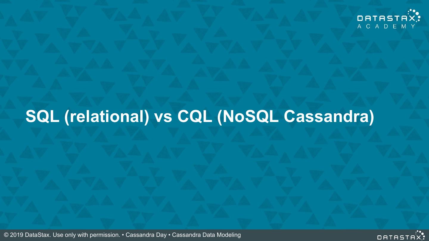 2 . SQL (relational) vs CQL (NoSQL Cassandra) © 2019 DataStax. Use only with permission. • Cassandra Day • Cassandra Data Modeling