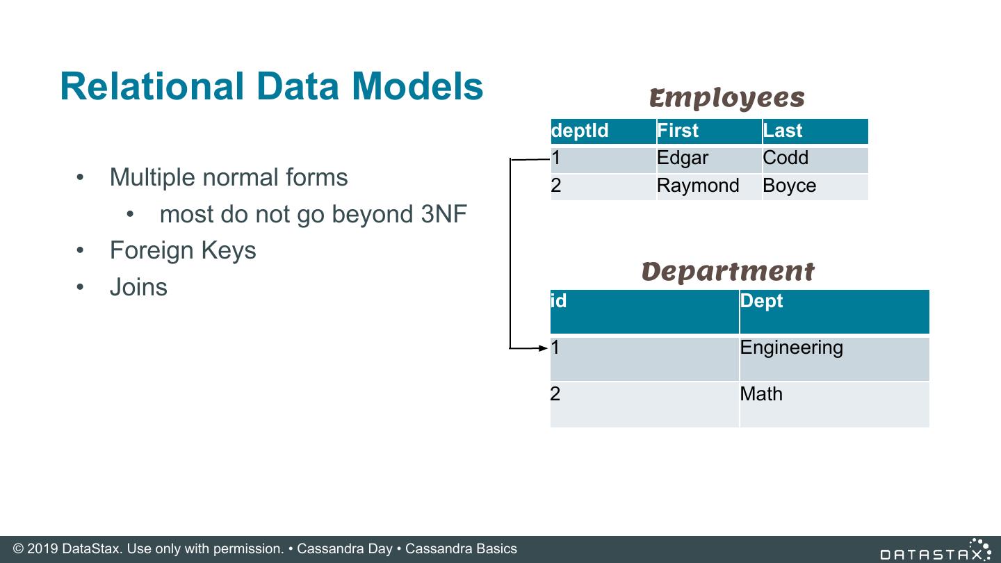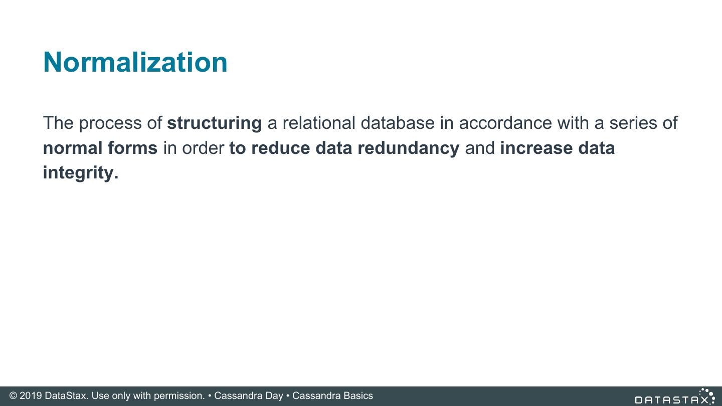 4 . Normalization The process of structuring a relational database in accordance with a series of normal forms in order to reduce data redundancy and increase data integrity. © 2019 DataStax. Use only with permission. • Cassandra Day • Cassandra Basics