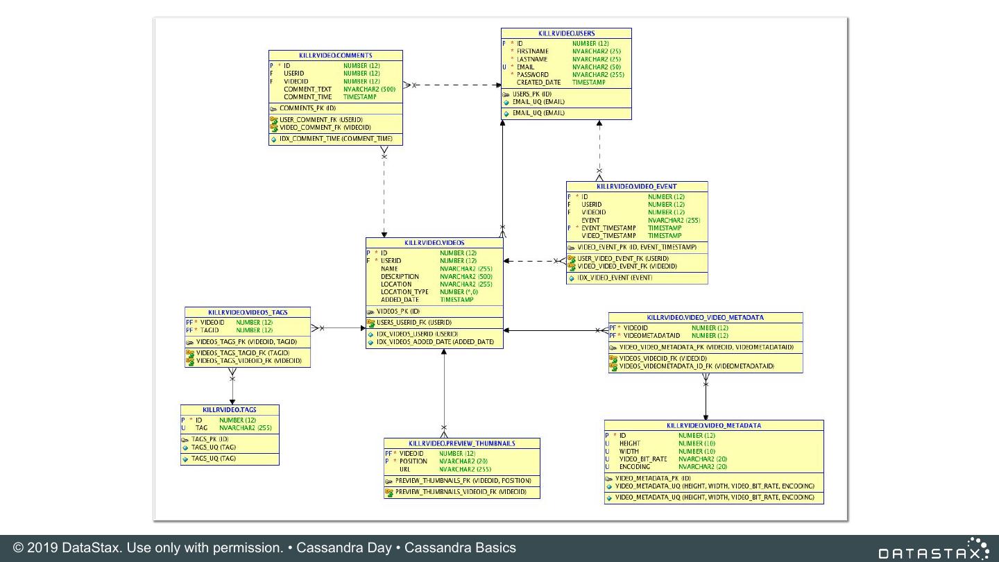 6 . Relational Modeling CREATE TABLE users ( id number(12) NOT NULL , firstname nvarchar2(25) NOT NULL , lastname nvarchar2(25) NOT NULL, email nvarchar2(50) NOT NULL, password nvarchar2(255) NOT NULL, created_date timestamp(6), • Create entity table PRIMARY KEY (id), CONSTRAINT email_uq UNIQUE (email) • Add constraints ); • Index fields -- Users by email address index CREATE INDEX idx_users_email ON users (email); • Foreign Key relationships CREATE TABLE videos ( id number(12), userid number(12) NOT NULL, name nvarchar2(255), description nvarchar2(500), location nvarchar2(255), location_type int, added_date timestamp, CONSTRAINT users_userid_fk FOREIGN KEY (userid) REFERENCES users (Id) ON DELETE CASCADE, PRIMARY KEY (id) ); © 2019 DataStax. Use only with permission. • Cassandra Day • Cassandra Basics
