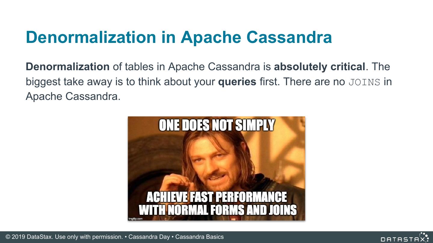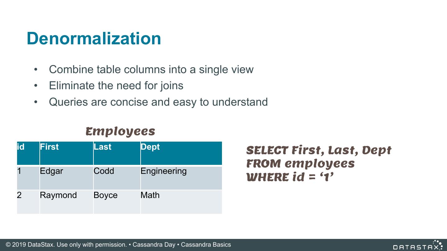 10 . Denormalization “The process of trying to improve the read performance of a database at the expense of losing some write performance by adding redundant copies of data.” © 2019 DataStax. Use only with permission. • Cassandra Day • Cassandra Basics