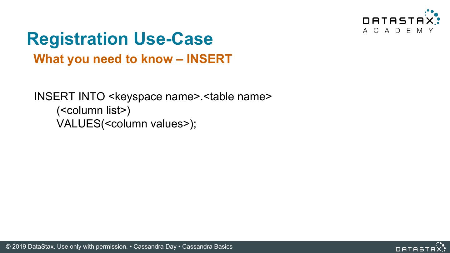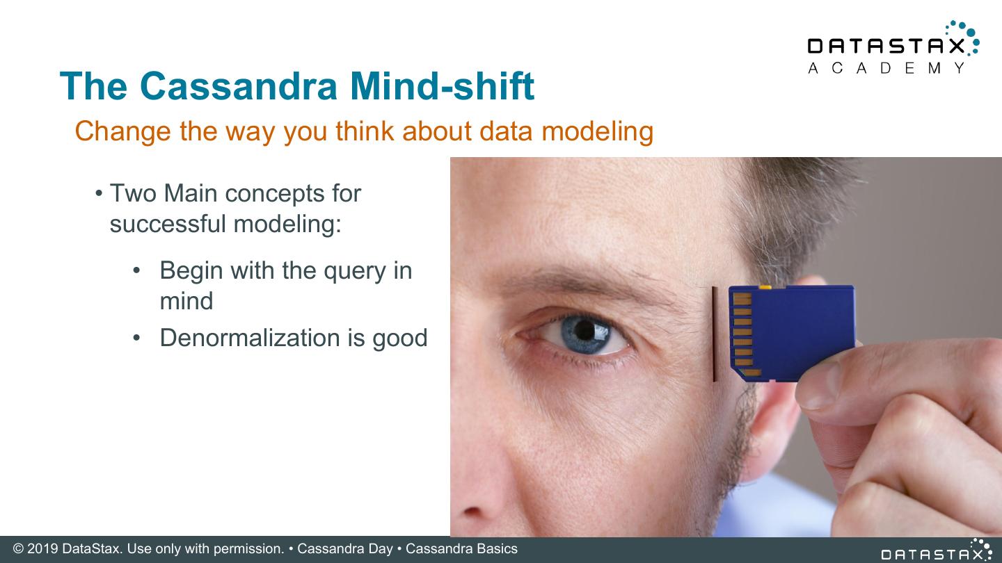 19 . The Cassandra Mind-shift Change the way you think about data modeling • Two Main concepts for successful modeling: • Begin with the query in mind • Denormalization is good © 2019 DataStax. Use only with permission. • Cassandra Day • Cassandra Basics
