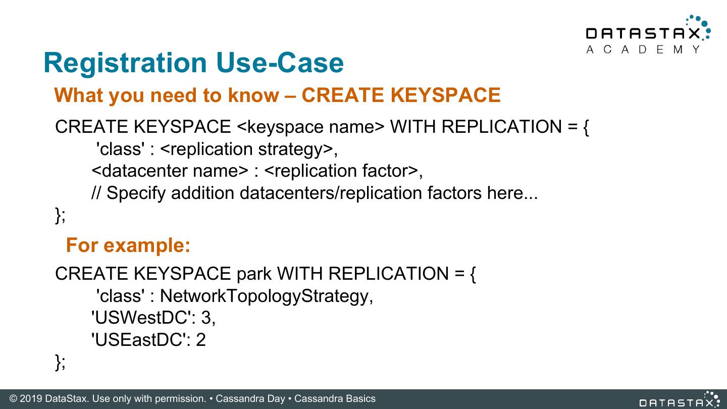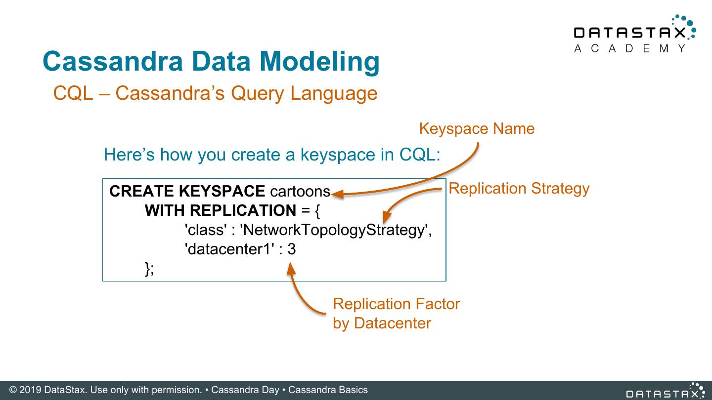 23 . Cassandra Data Modeling CQL – Cassandra’s Query Language Keyspace Name Here’s how you create a keyspace in CQL: CREATE KEYSPACE cartoons Replication Strategy WITH REPLICATION = { 'class' : 'NetworkTopologyStrategy', 'datacenter1' : 3 }; Replication Factor by Datacenter © 2019 DataStax. Use only with permission. • Cassandra Day • Cassandra Basics
