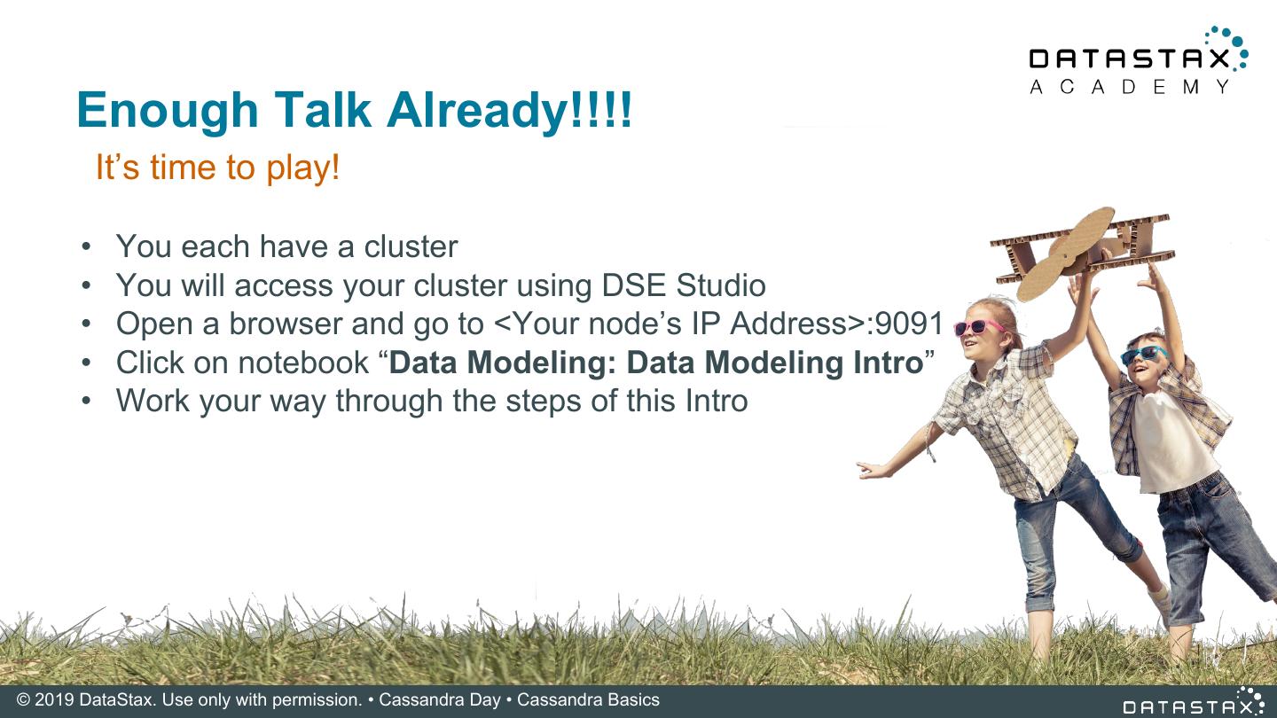26 . Enough Talk Already!!!! It’s time to play! • You each have a cluster • You will access your cluster using DSE Studio • Open a browser and go to <Your node’s IP Address>:9091 • Click on notebook “Data Modeling: Data Modeling Intro” • Work your way through the steps of this Intro © 2019 DataStax. Use only with permission. • Cassandra Day • Cassandra Basics