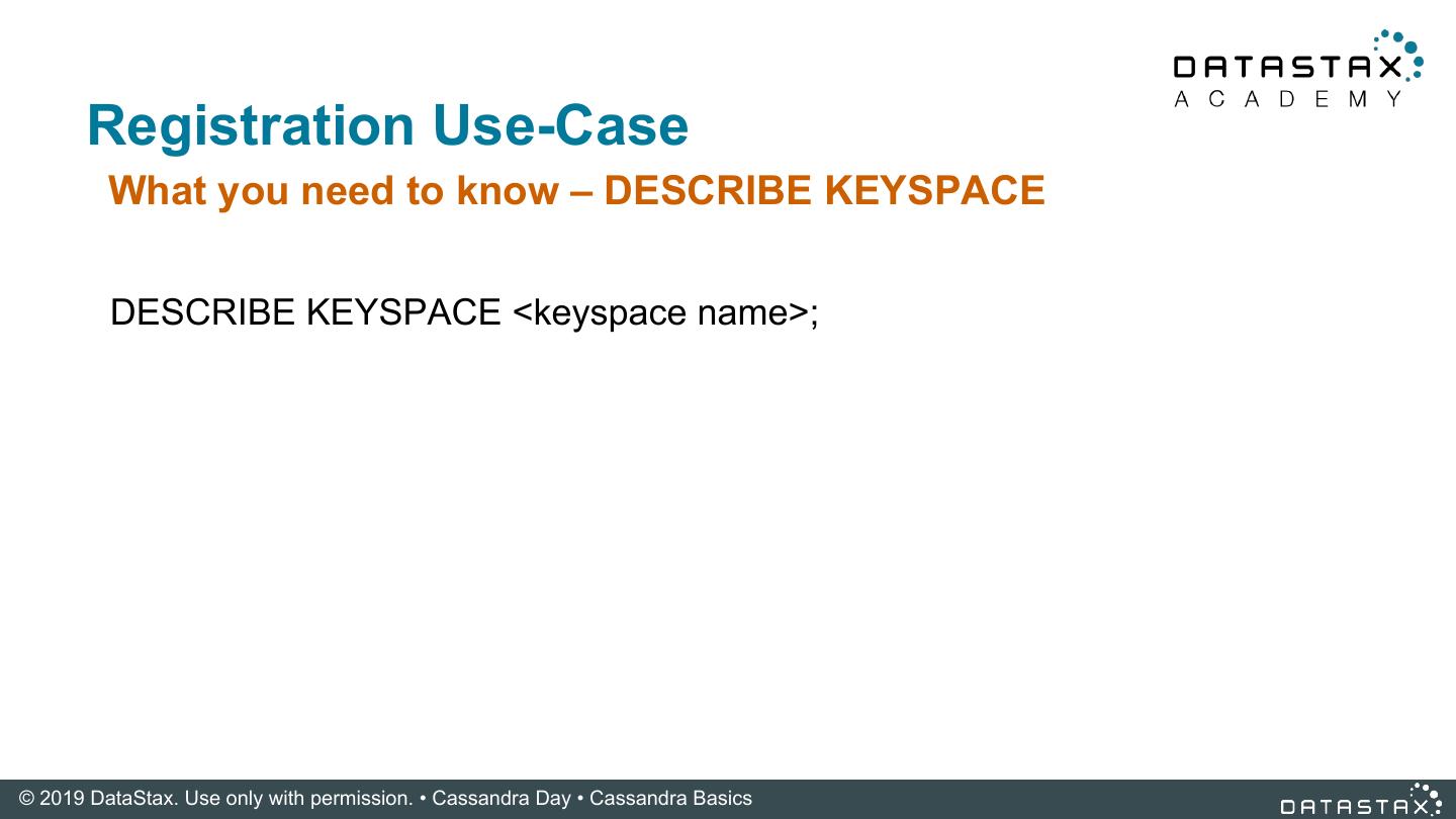25 . Cassandra Data Modeling CQLSH – Investigating our schema To list your keyspaces: DESCRIBE KEYSPACES; To look at a specific keyspace definition: DESCRIBE KEYSPACE cartoon; To look at a table definition: DESCRIBE TABLE cartoon.characters_by_city; © 2019 DataStax. Use only with permission. • Cassandra Day • Cassandra Basics
