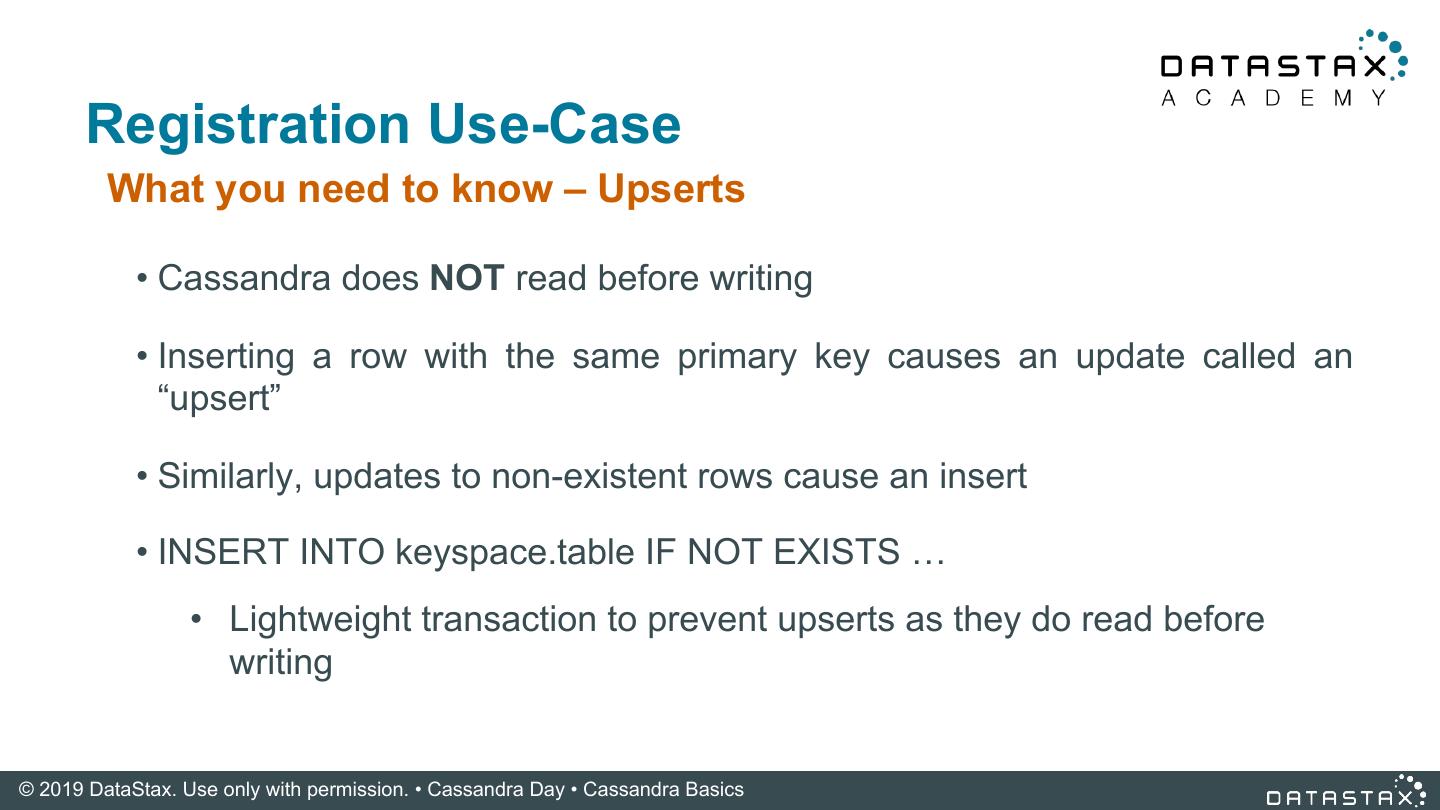 3 . Structuring Your Database Normalization: To reduce data redundancy and increase data integrity. Denormalization: Must be done in read heavy workloads to increase performance © 2019 DataStax. Use only with permission. • Cassandra Day • Cassandra Basics