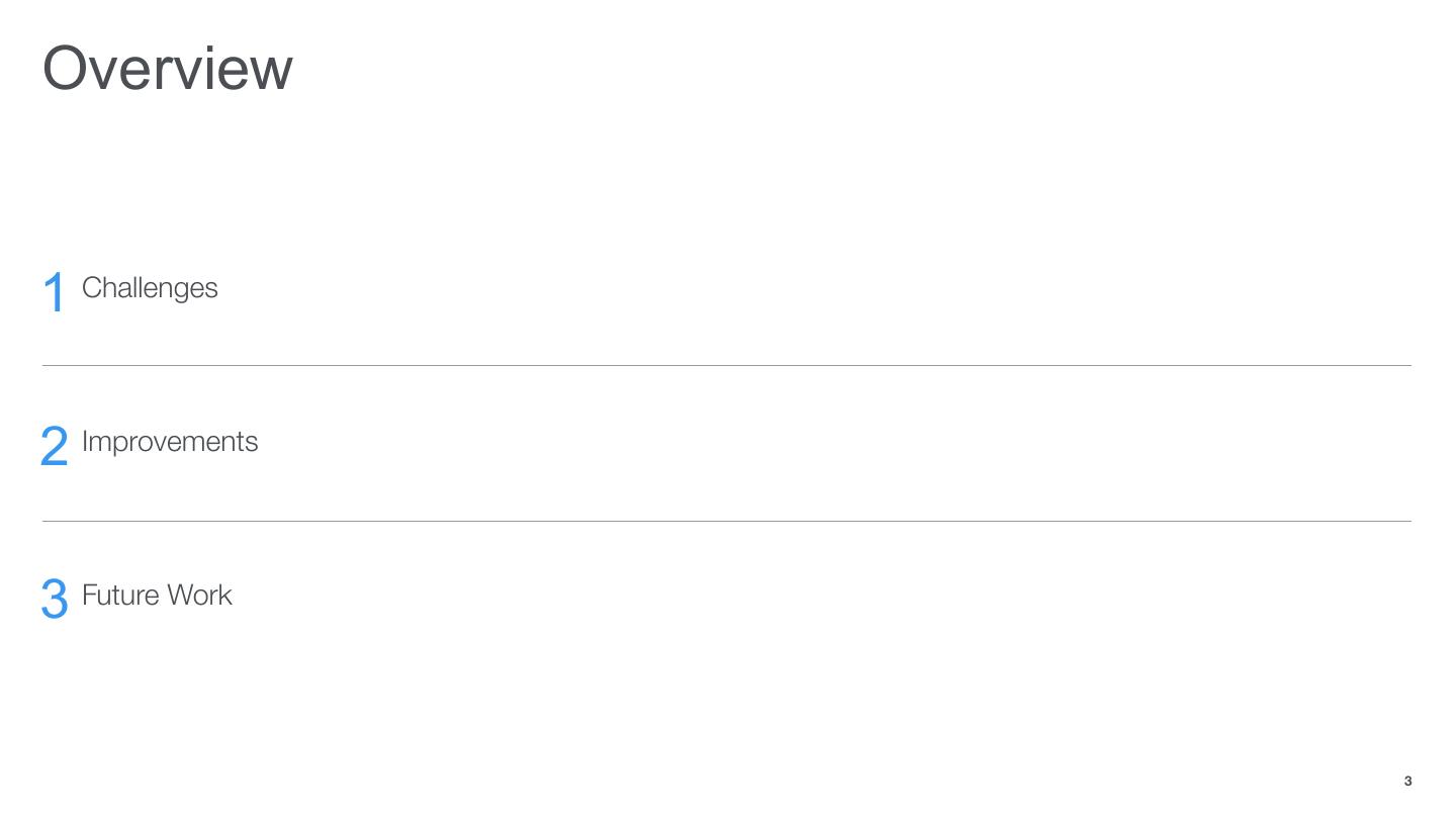 3 .Overview 1 Challenges 2 Improvements 3 Future Work 3