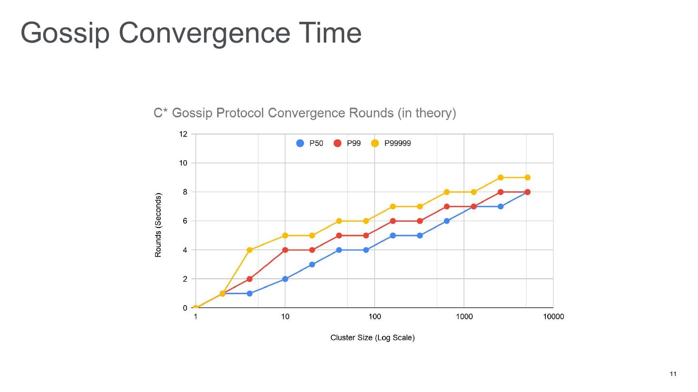 10 .Gossip Convergence Time ● Convergence Time increases with the size of the cluster ● Worsened by: ○ JAVA GC ○ Network Delay (Multiple Continents) ○ Message Processing Time ● Cassandra ring delay: 30 seconds ○ -Dcassandra.ring_delay_ms 10