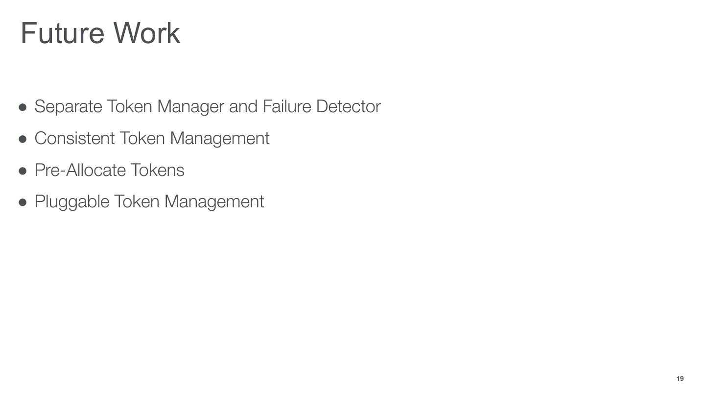 19 .Future Work ● Separate Token Manager and Failure Detector ● Consistent Token Management ● Pre-Allocate Tokens ● Pluggable Token Management 19