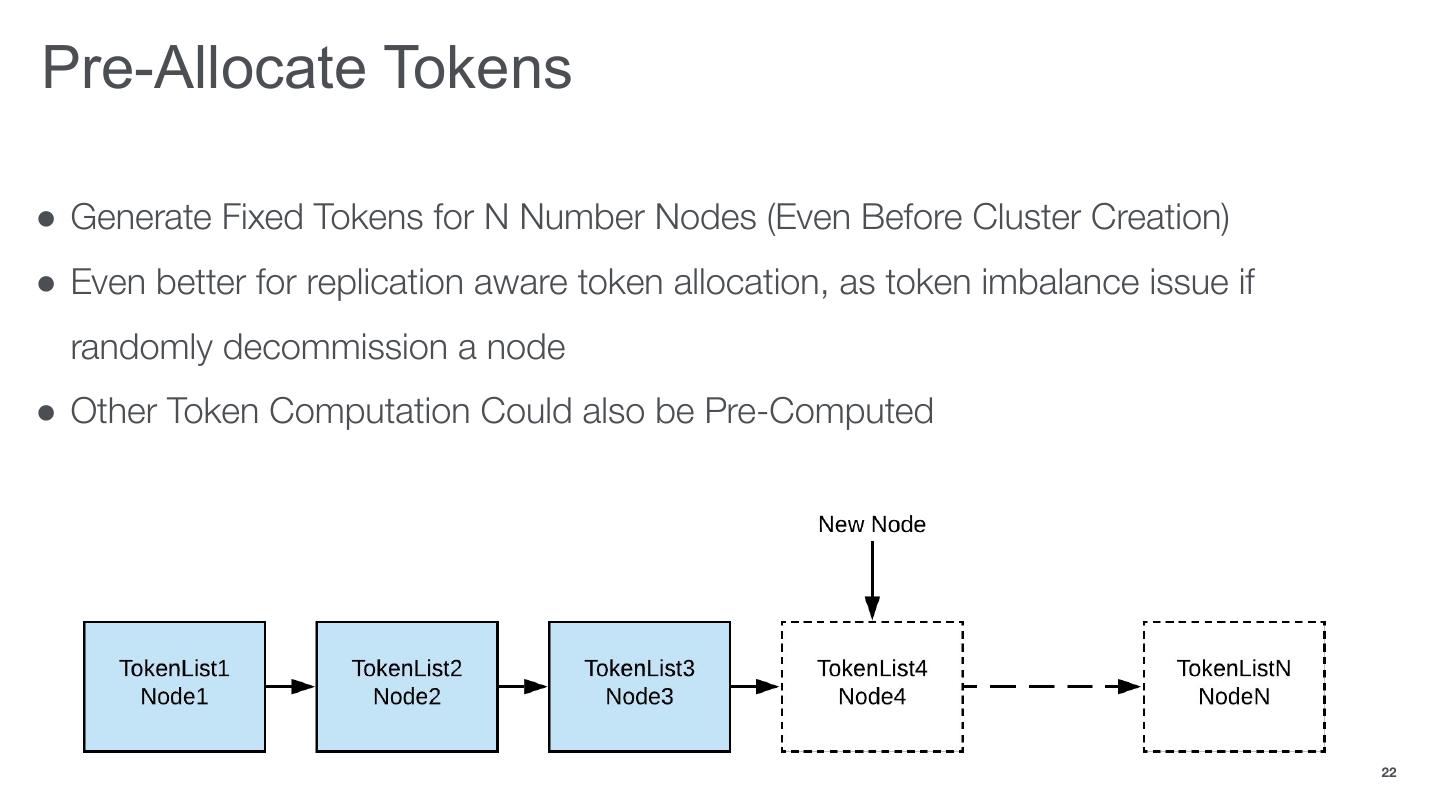 22 .Pre-Allocate Tokens ● Generate Fixed Tokens for N Number Nodes (Even Before Cluster Creation) ● Even better for replication aware token allocation, as token imbalance issue if randomly decommission a node ● Other Token Computation Could also be Pre-Computed 22