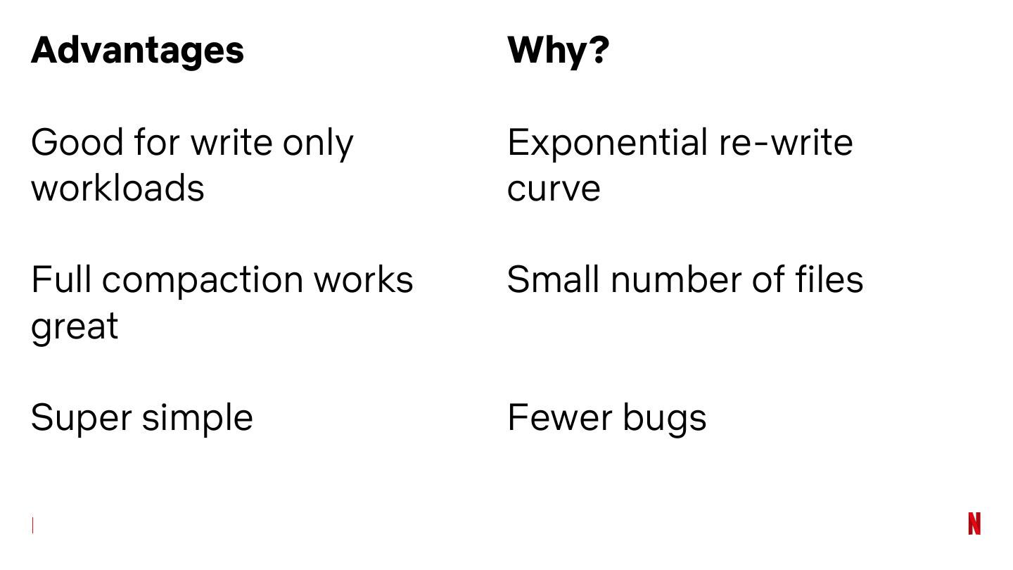 22 .Advantages Why? Good for write only Exponential re-write workloads curve Full compaction works Small number of files great Super simple Fewer bugs