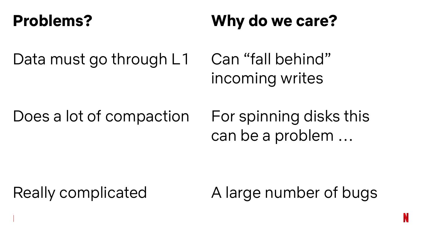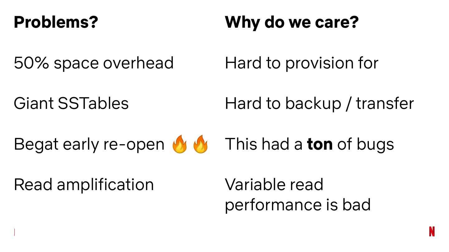 23 .Problems? Why do we care? 50% space overhead Hard to provision for Giant SSTables Hard to backup / transfer Begat early re-open 🔥🔥 This had a ton of bugs Read amplification Variable read performance is bad
