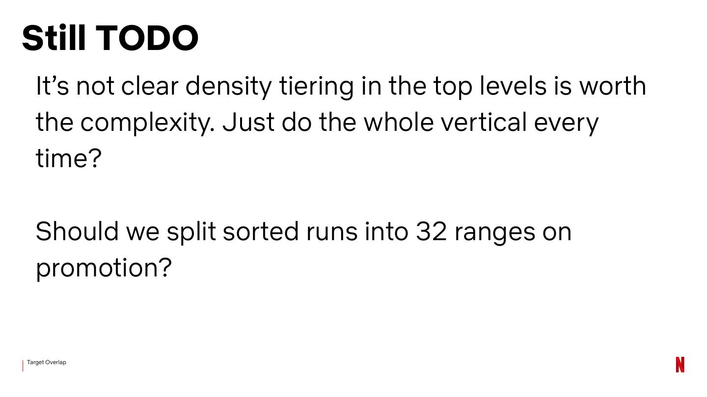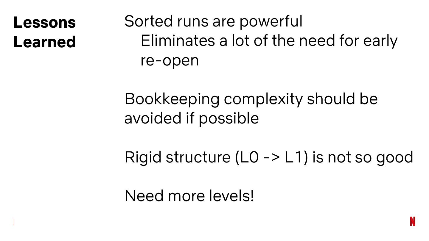 25 .Lessons Large single files are problematic Learned Need to wait until we have enough work from flushes to do. Time bounds on full compaction is nice