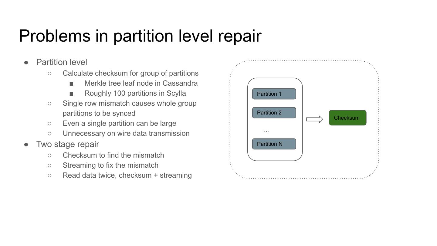 4 .Problems in partition level repair ● Partition level ○ Calculate checksum for group of partitions ■ Merkle tree leaf node in Cassandra ■ Roughly 100 partitions in Scylla Partition 1 ○ Single row mismatch causes whole group partitions to be synced Partition 2 Checksum ○ Even a single partition can be large ... ○ Unnecessary on wire data transmission ● Two stage repair Partition N ○ Checksum to find the mismatch ○ Streaming to fix the mismatch ○ Read data twice, checksum + streaming